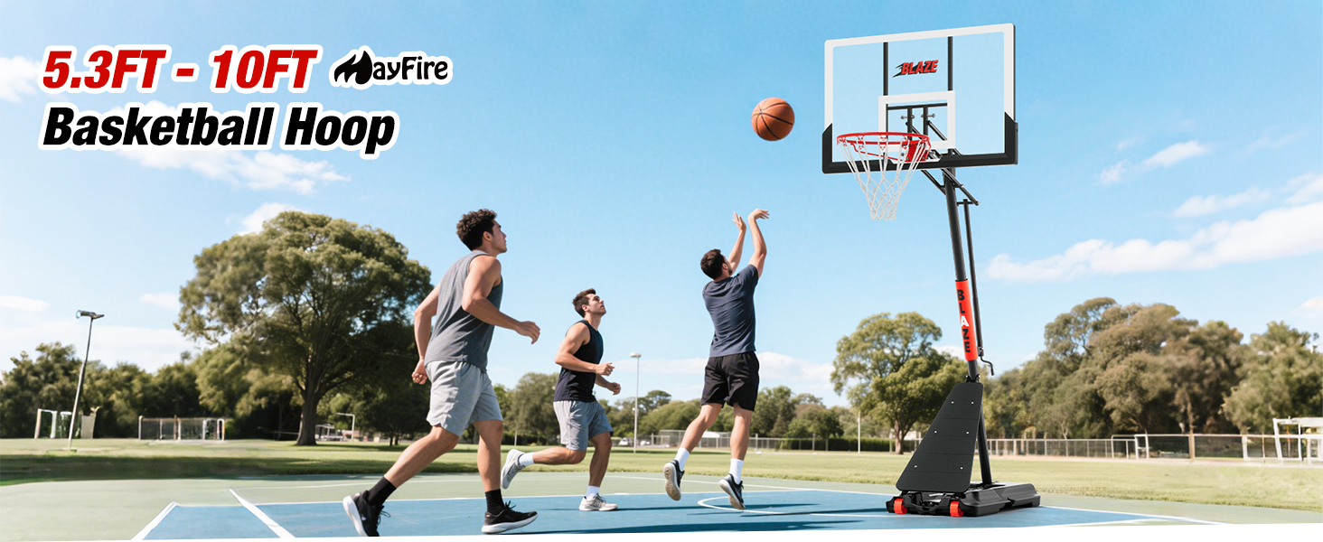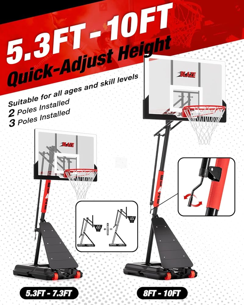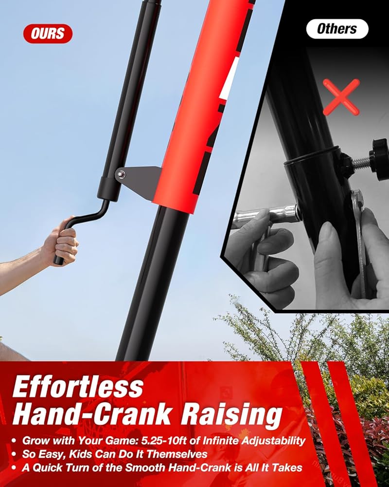 5.3-10FT Quick Height Adjustment: With an intuitive crank system, our outdoor basketball hoop lets youth and adults easily adjust the height from 5.3 to 10 feet. No more fixed-height limitations—this adjustable design grows with your family, offering endless practice and fun for players of all ages
