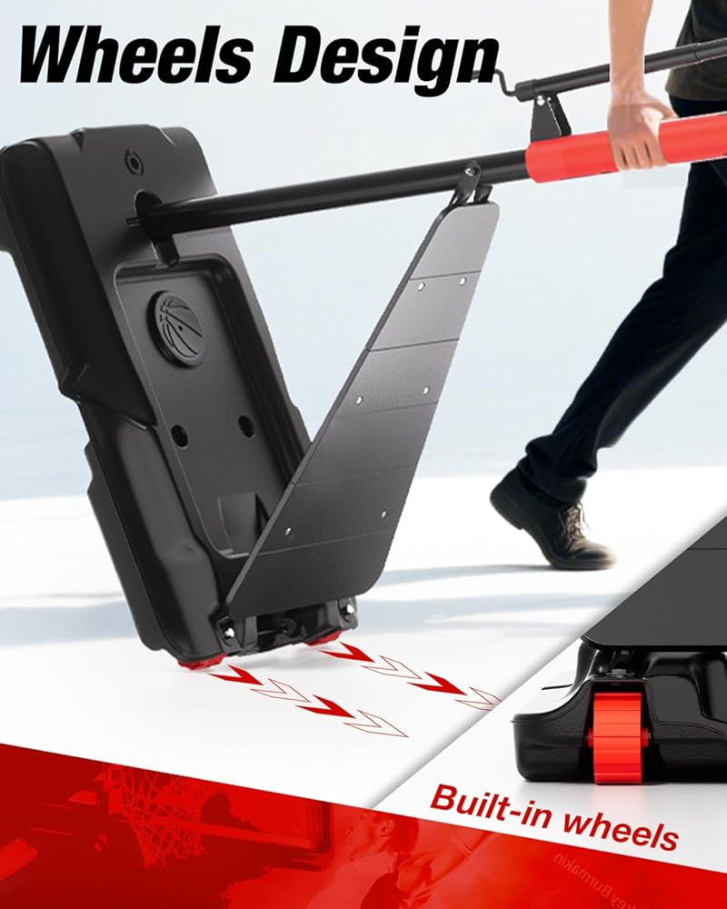 Portable Basketball Goal: Two sturdy wheels make moving our basketball goal a breeze. Whether you want to play in the backyard, garage, or park, relocate it effortlessly. Enjoy basketball anywhere, anytime