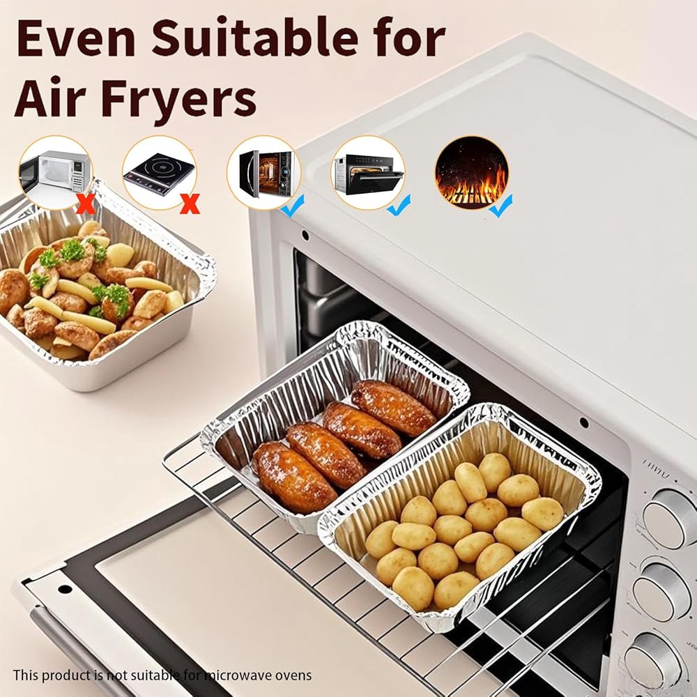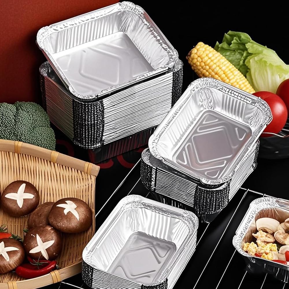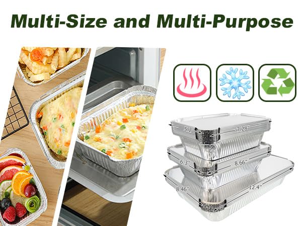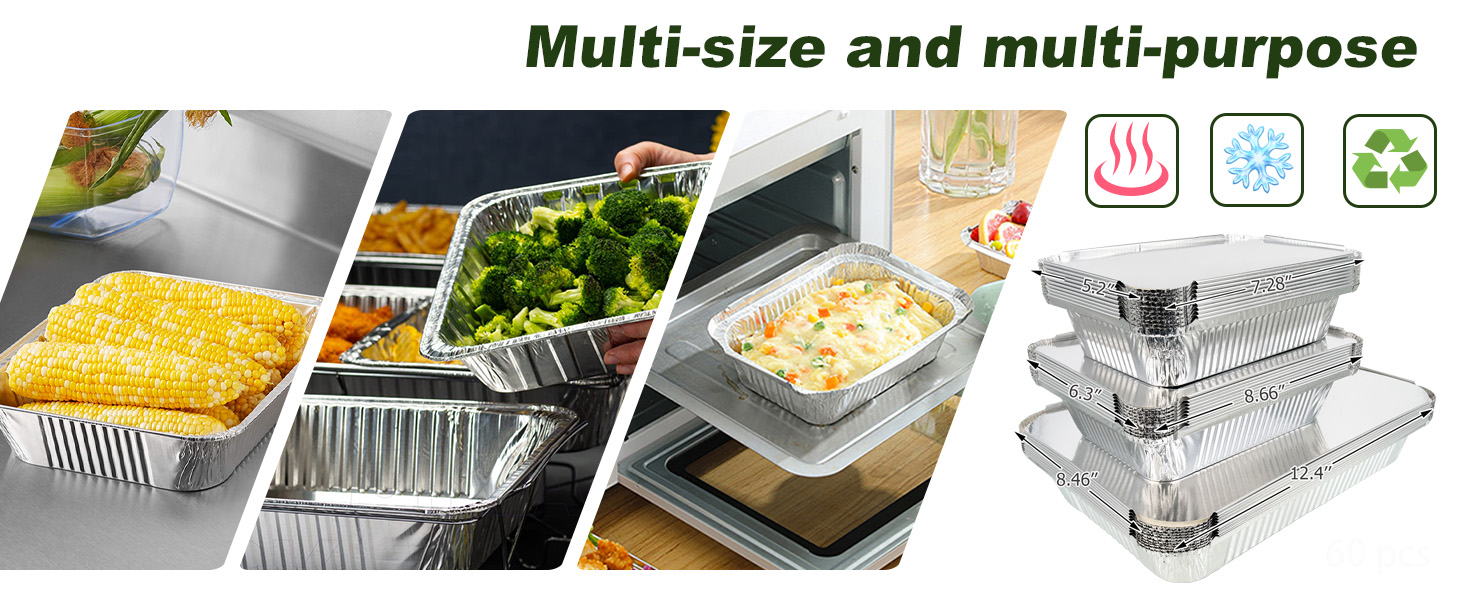 حاويات ألومنيوم متعددة الأغراض: يمكن استخدام مقالي الألومنيوم للاستعمال مرة واحدة في خبز عيد الميلاد وعيد الشكر، وكذلك في البوفيهات وحفلات الاستقبال والمآدب والخبز والنزهات وحفلات الشواء. تعتبر مقالي رقائق الألومنيوم ذات الأغطية آمنة للشواء على الفحم أو الفرن أو اللهب المكشوف. (غير آمن للاستخدام في الميكروويف)