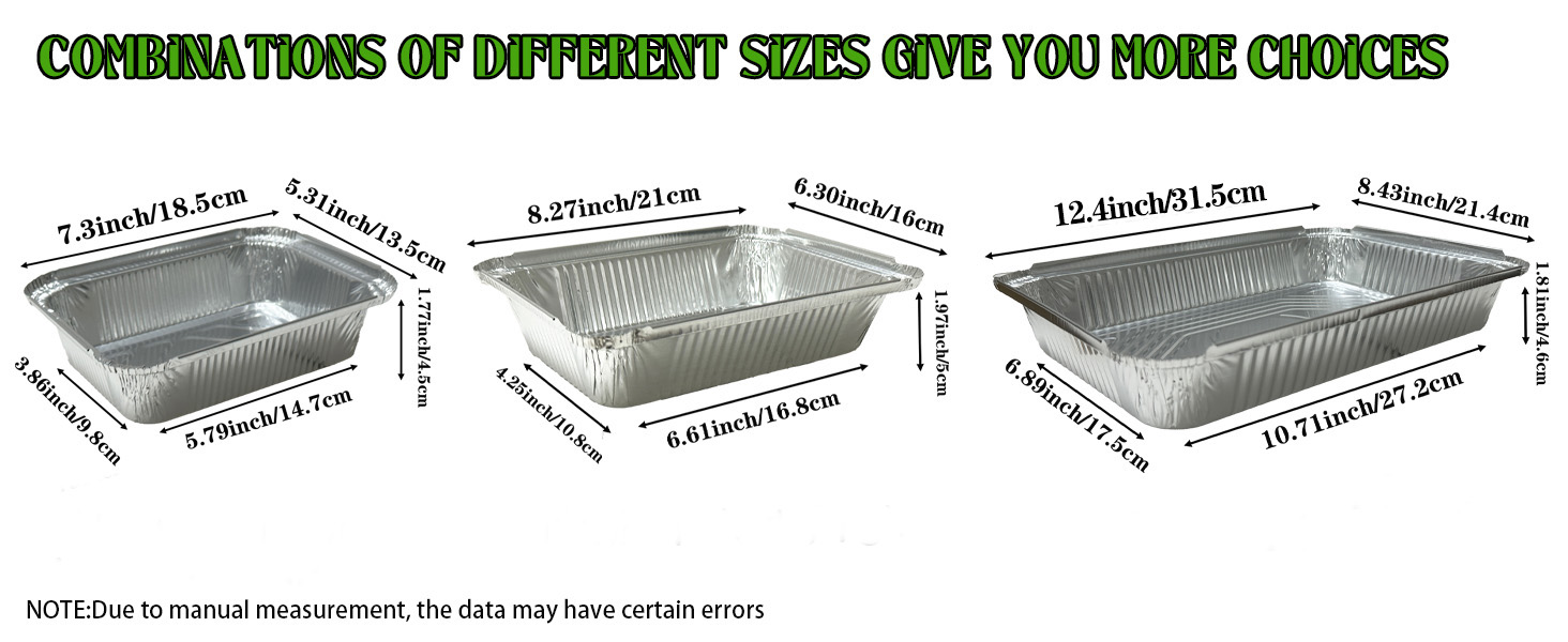 محتوى العبوة: تتضمن مجموعة منتجاتنا ما مجموعه 35 صينية من رقائق الألومنيوم (بما في ذلك 14.20*8.43*1.80 بوصة/74.4 أونصة*12 قطعة، 8.27*6.30*1.97 بوصة/37.2 أونصة*10 قطع، 7.28*5.30*1.77 بوصة/23.67 أونصة*13 قطعة). هذه الأحجام المختلفة من مقلاة رقائق الألومنيوم يمكن أن تلبي احتياجاتك الفردية في المواقف المختلفة. تلبية احتياجاتك الفردية في مواقف مختلفة.