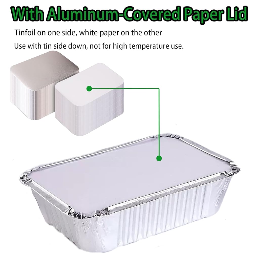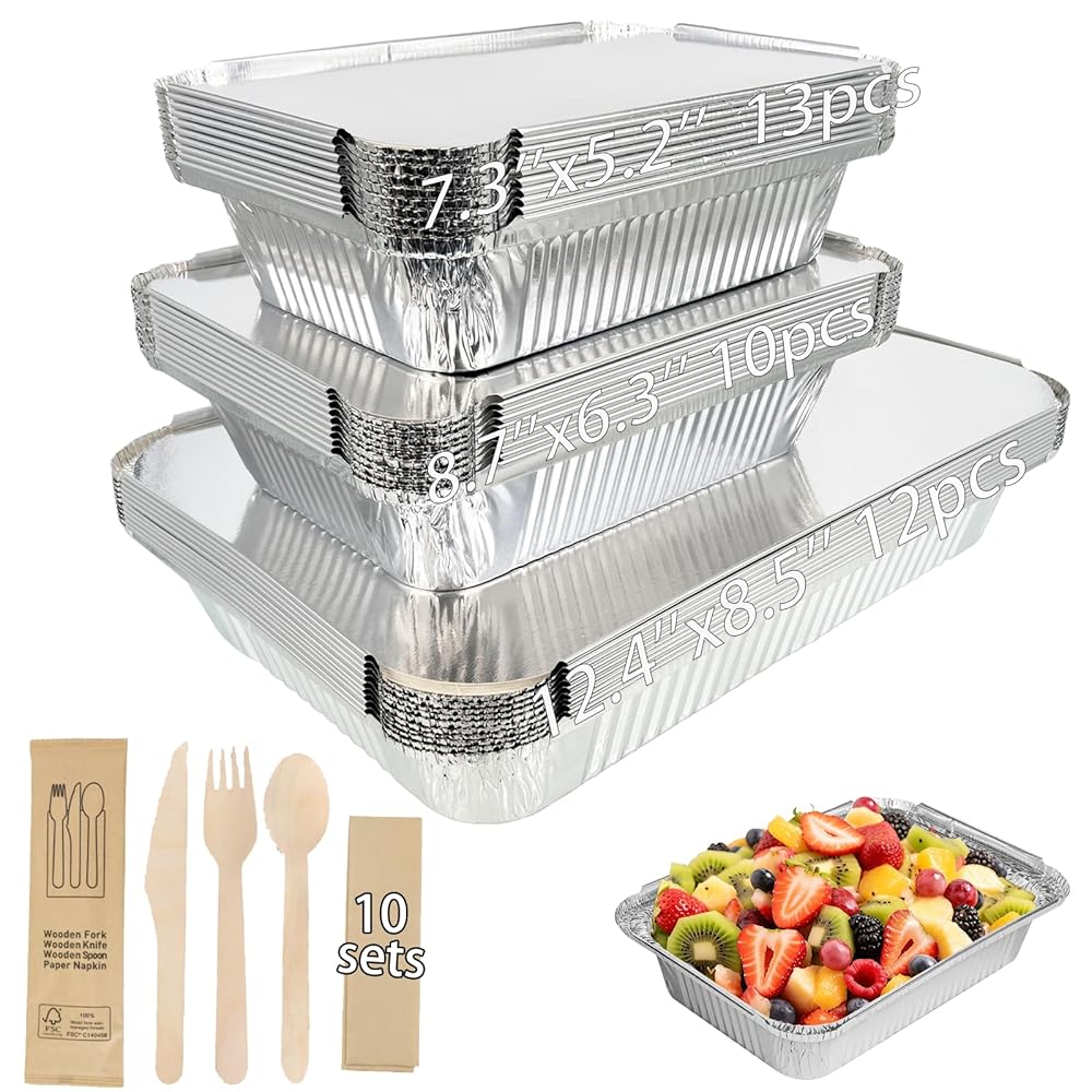 BIBRADAA® 35 عبوة من مقالي الألومنيوم بأغطية، 2200 مل (4.4 رطل)/1100 مل (2.4 رطل)/700 مل (1.5 رطل) مقالي رقائق معدنية بأغطية، مقالي رقائق الألومنيوم، لتقديم الطعام، وإعداد الوجبات والإخراج. تأتي مع 10 مجموعات من أدوات المائدة الخشبية.