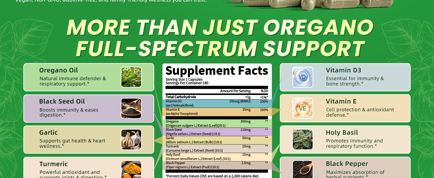 • 8 مكونات قوية في كبسولة واحدة: زيت الأوريجانو (aceite de oregano)، وزيت الحبة السوداء، والثوم، والكركم، والريحان المقدس، والفلفل الأسود، وفيتامينات D3 وE مجتمعة للحصول على دعم كامل للمناعة والجهاز الهضمي والجهاز التنفسي.*