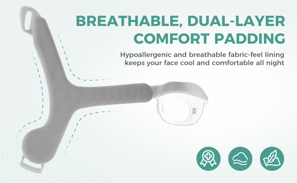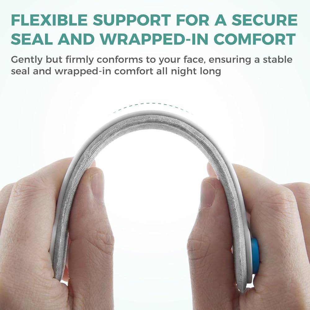 بطانة مريحة مزدوجة الطبقات: قل وداعًا لعلامات الوجه الصباحية. على عكس إطارات السيليكون القياسية، يتميز الإطار المطور ببطانة إسفنجية ناعمة ممتازة مزدوجة الطبقة. تتكيف هذه المادة الطبية الناعمة الملمس بلطف مع ملامح وجهك، مما يوفر حاجزًا "يشبه السحابة" بين القناع وخديك للحصول على راحة فائقة طوال الليل.