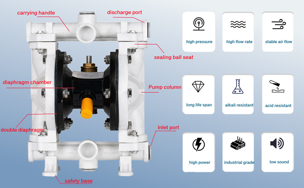 【مادة ممتازة】تتميز مضخات الحجاب الحاجز المزدوجة التي تعمل بالهواء بأغشية PTFE لضمان المتانة وعمر الخدمة الطويل. غطاء مضخة الحجاب الحاجز مصنوع من مادة البولي بروبيلين، ومثبت بمسامير، ومضاد للتسرب، ومتين، ولن يسقط بعد الاستخدام طويل الأمد.