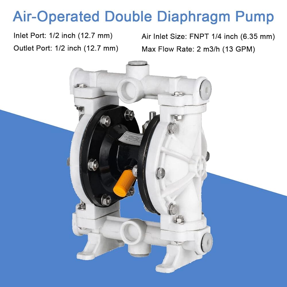 مضخة غشاء مزدوجة تعمل بالهواء من مادة البولي بروبيلين مع أغشية PTFE بحد أقصى 100 رطل لكل بوصة مربعة 13 GPM مضخة غشاء مزدوجة هوائية لاستخدام السوائل الكيميائية والصناعية (مدخل/مخرج 1/2 بوصة)