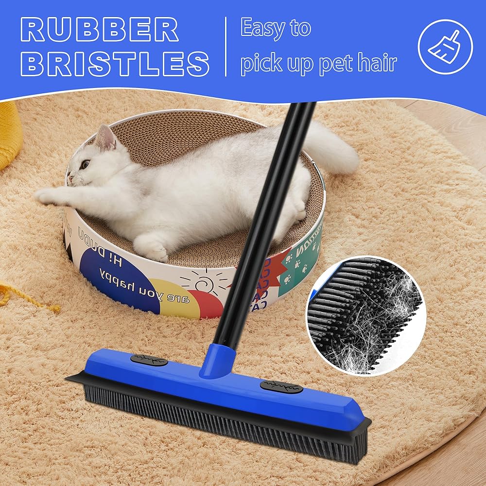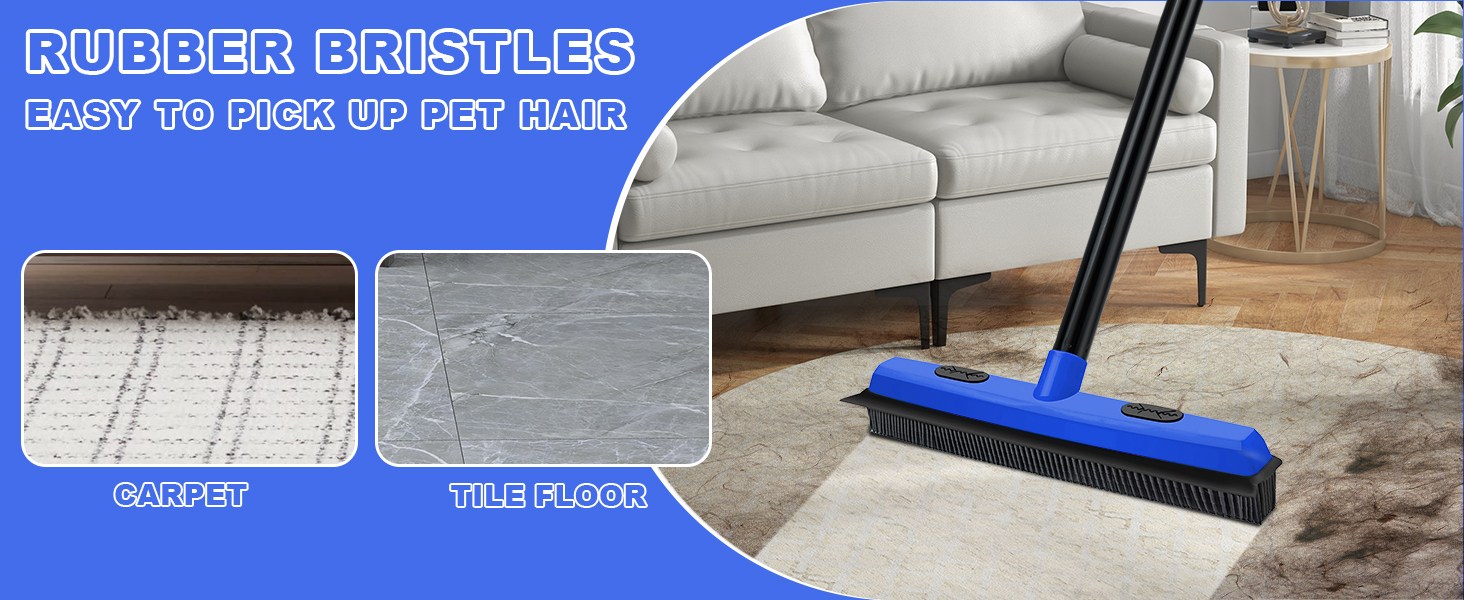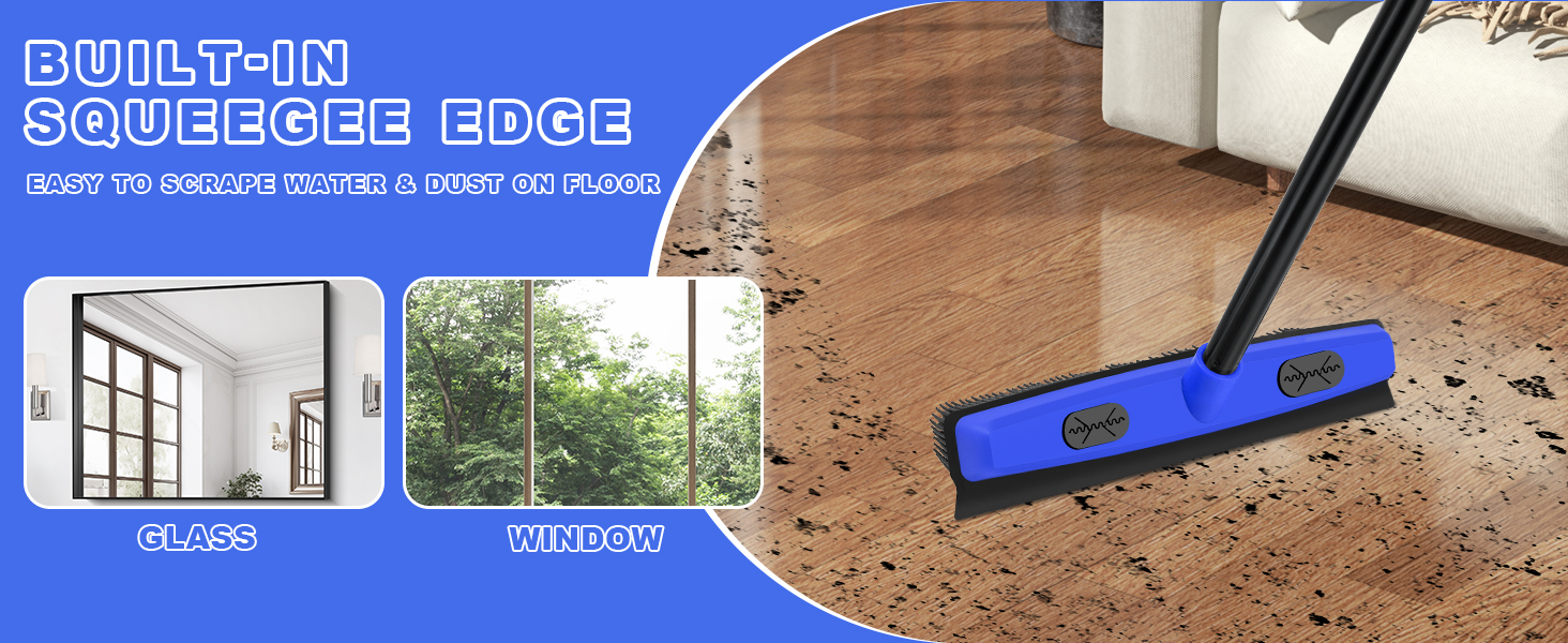 حافة ممسحة مدمجة: تتميز مكنسة شعر الحيوانات الأليفة بقضيب ممسحة مطاطية، تمسح الغبار أو ماء الصابون أو السوائل المنسكبة على السجاد غير اللامع أو الأرضيات الصلبة أو البلاط أو الخرسانة أو أسطح الفناء أو النوافذ دون ترك خطوط.