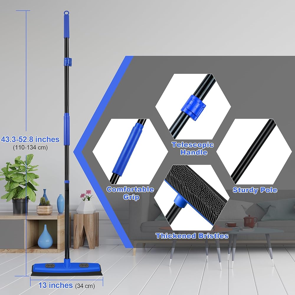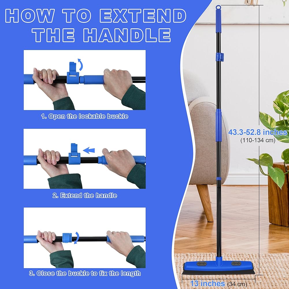 مقبض تلسكوبي: يمكن تعديل طول عمود مكنسة الشعر المطاطية هذه من 43.3 بوصة إلى 52.8 بوصة. إنها تسمح لك بالوقوف بشكل مستقيم لإجراء عملية المسح بشكل مريح. لا مزيد من الانحناء أو الركوع أو الانحناء عند القيام بالأعمال المنزلية