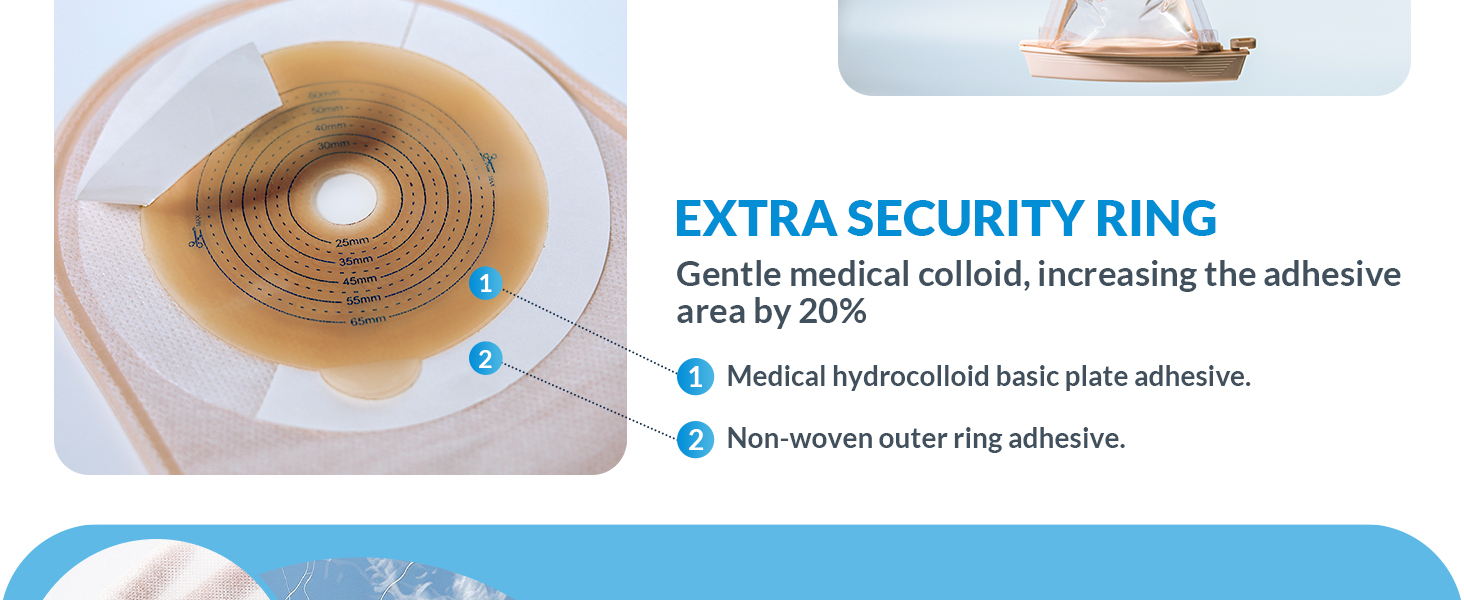 • تثبيت صلب كالصخر: تتميز أكياس فغر القولون هذه المكونة من قطعة واحدة بتصميم مزدوج اللصق مع قاعدة غرواني مائي متقدمة بالإضافة إلى حلقة خارجية من القماش الناعم. يوفر هذا تثبيتًا قويًا، ويقضي فعليًا على التسربات ويمنحك أمانًا وثباتًا معززًا ليلاً أو نهارًا.