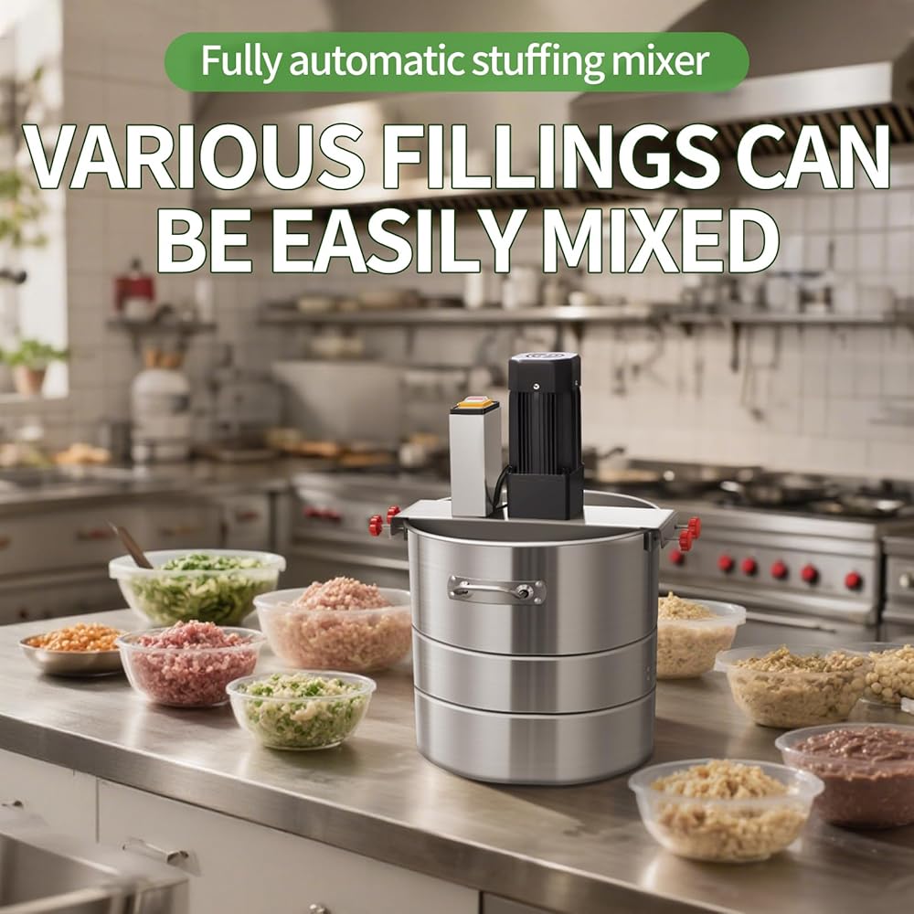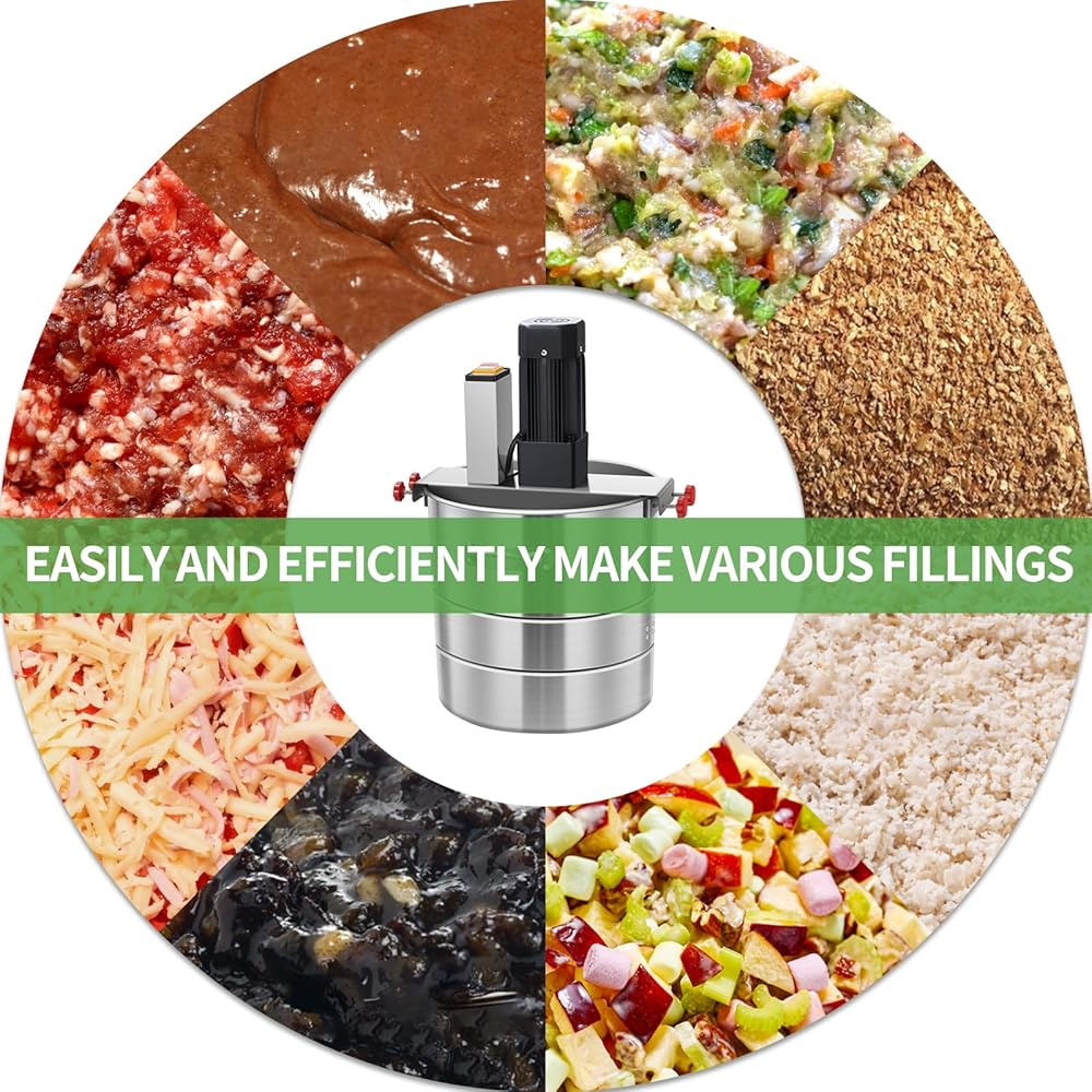 【خلط عالي السعة】 يمزج بكفاءة ما يصل إلى 15 كجم من المكونات، وهو مثالي للحشوات المختلفة وحشو الزلابية والسلطات والمساحيق الجافة واللحوم والخضروات والتوابل والعجين، مما يوفر الوقت للاستخدام التجاري أو المنزلي.
