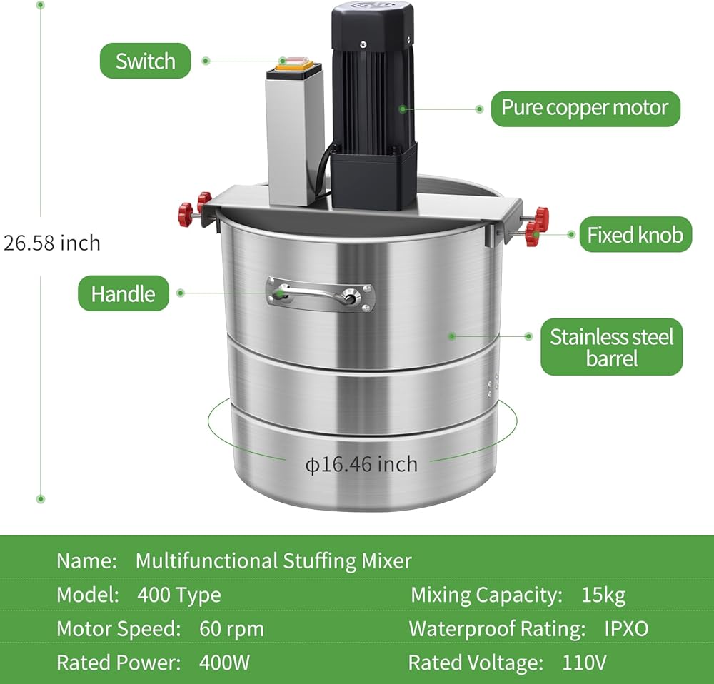 【تصميم متعدد الوظائف】 متعدد الاستخدامات لمهام الخلط المختلفة، بما في ذلك حشو النقانق وإعداد كرات اللحم وعجين المعجنات، مما يعزز إنتاجية المطبخ.