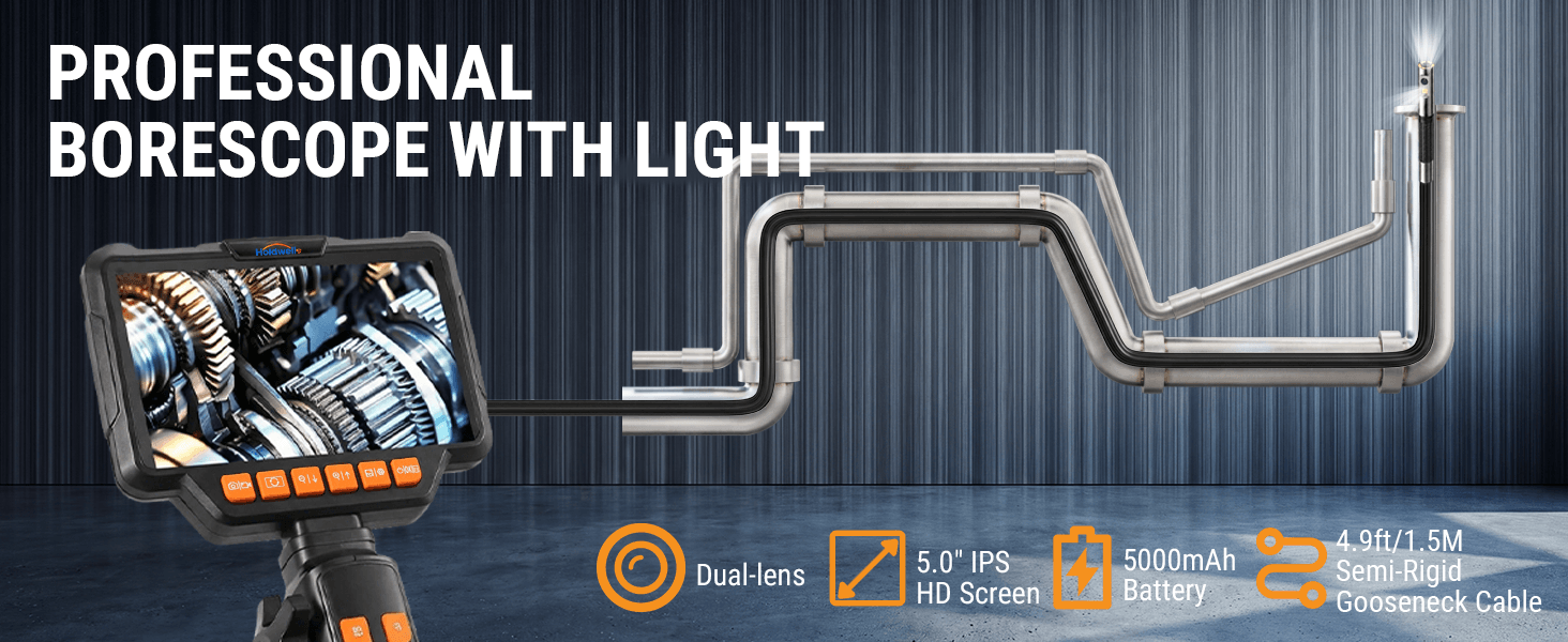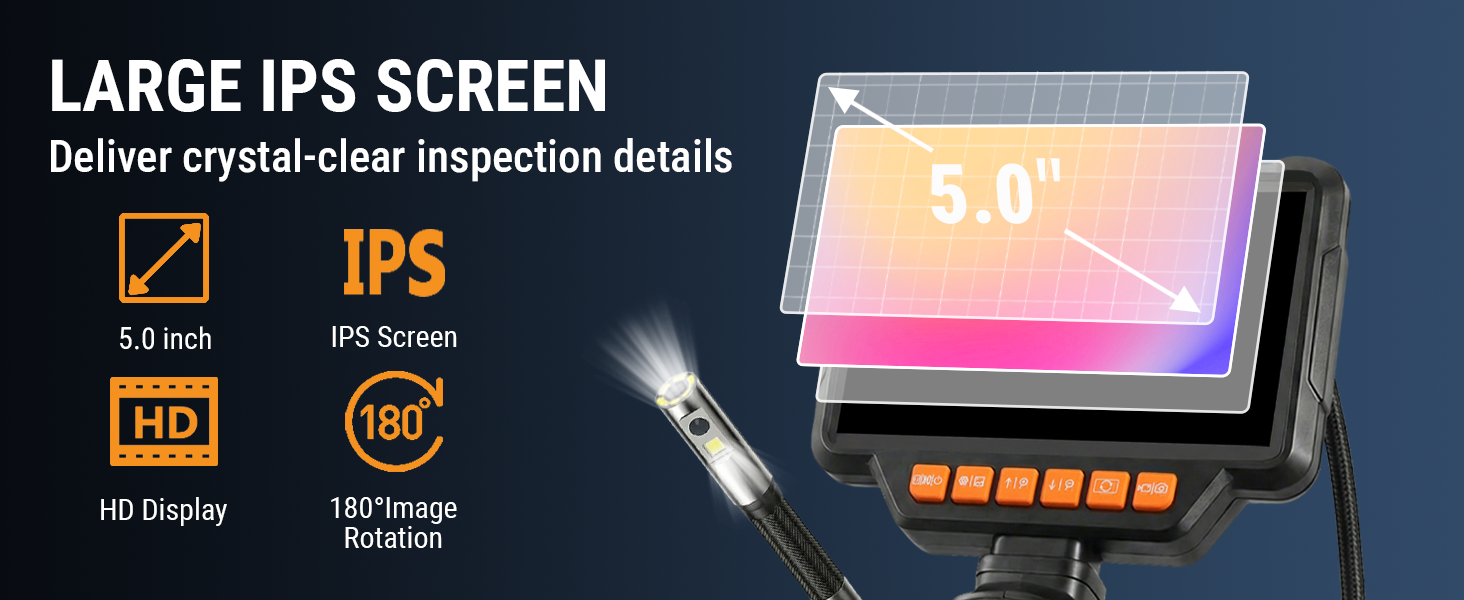 شاشة IPS مقاس 5 بوصات مع صور واضحة بدقة 720 بكسل: توفر شاشة IPS مقاس 5 بوصات المحسنة صورًا أكثر وضوحًا وسطوعًا مقارنة بشاشات مقاس 4.3 بوصة، مما يوضح المزيد من التفاصيل عن العيوب والشقوق المخفية. مجهزة بدقة 720 بكسل عالية الدقة وتكبير 5 مستويات (1X/2X/4X/6X/8X)، مما يجعل كل عملية فحص دقيقة وفعالة.