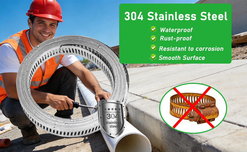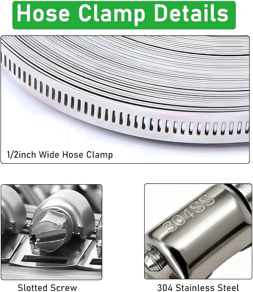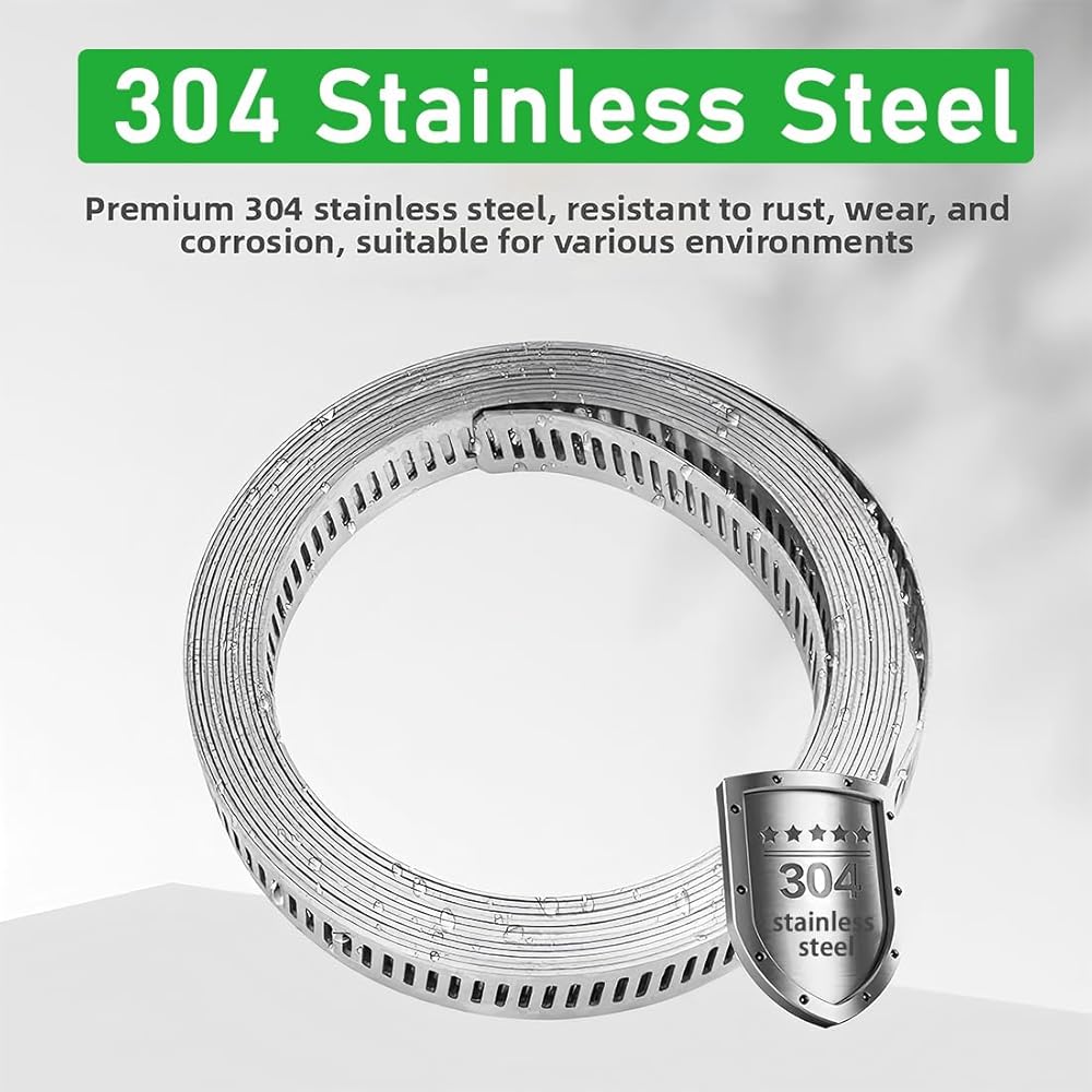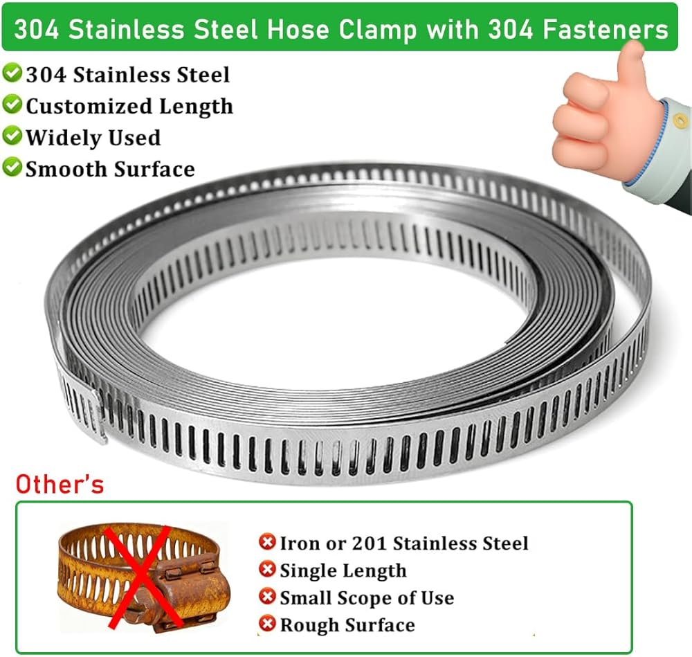 مشابك خرطوم من الفولاذ المقاوم للصدأ: حزام بطول 65.5 قدم و20 قطعة مثبتات كلها مصنوعة من الفولاذ المقاوم للصدأ 304 عالي الجودة، وليس 201 SS. ستدوم مشابك التروس الدودية هذه إلى الأبد، وقابلة لإعادة الاستخدام، ومضادة للصدأ ومضادة للتآكل، ومناسبة جدًا للمشروع الخارجي!