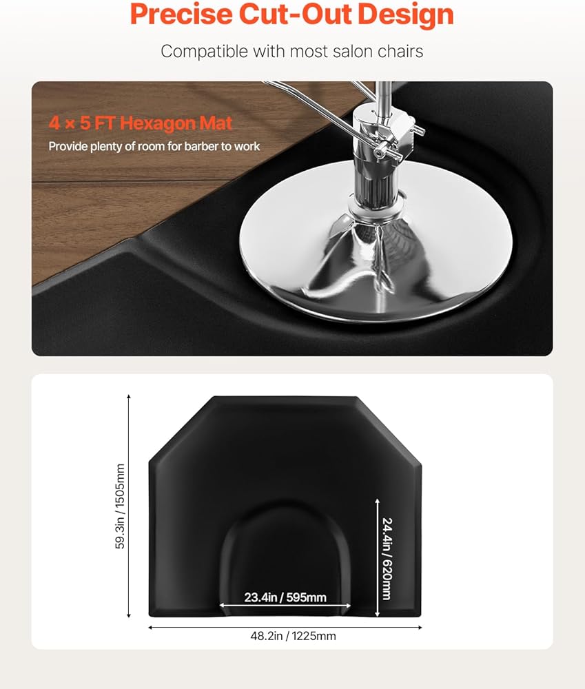 حجم كبير جدًا: توفر سجادة الصالون السداسية مقاس 4 × 5 أقدام لمصففي الشعر مساحة واسعة للوقوف، مما يسمح للحلاقين بالتحرك بحرية والعمل بكفاءة أكبر. مقاس 23.4 بوصة × 24.4 بوصة (595 × 620 ملم) يناسب معظم كراسي الصالون ذات القاعدة المستديرة، ويبقى ثابتًا في مكانه دون تغيير