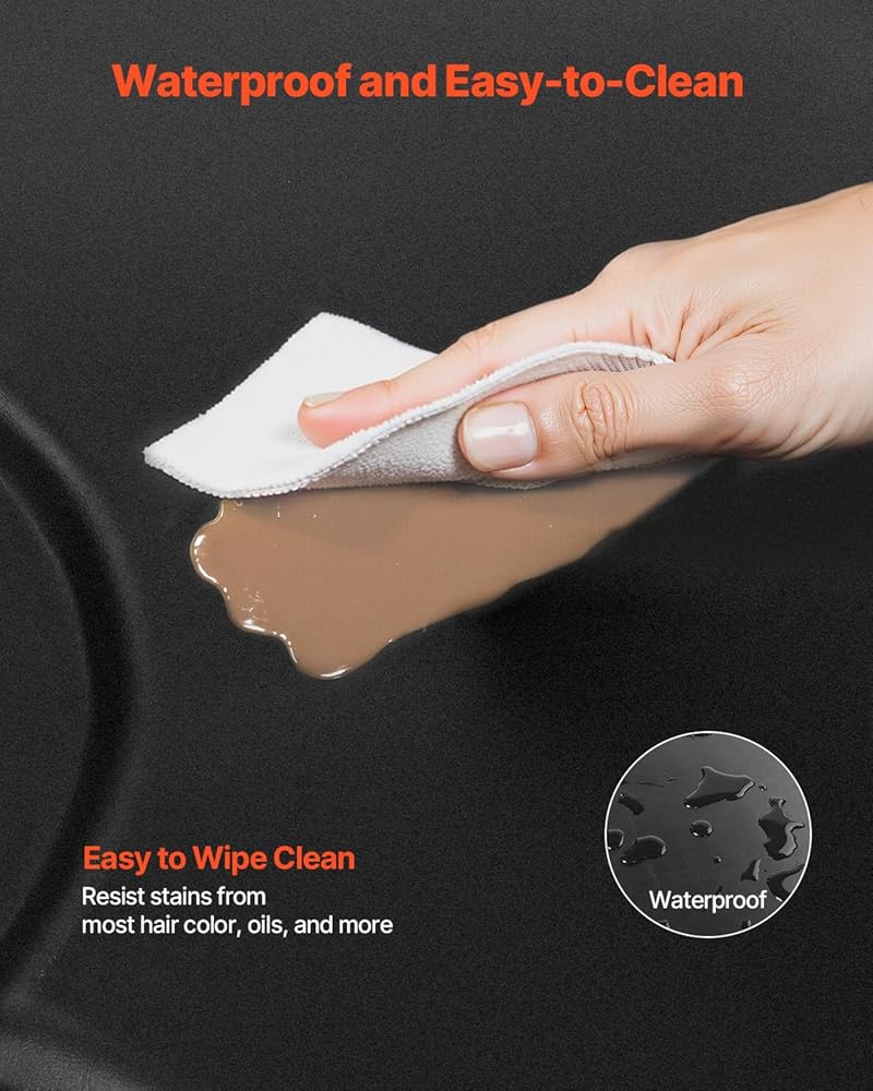 سهلة التنظيف: سطح سجادة الصالون مصنوع من مادة PVC المقاومة للماء وسهلة التنظيف. مقاوم للبقع الناتجة عن معظم ألوان الشعر والزيوت وغير ذلك الكثير، ويمكن مسحه بسهولة، مما يضمن بقاء مساحة العمل الخاصة بك مرتبة ونظيفة للاستخدام اليومي.