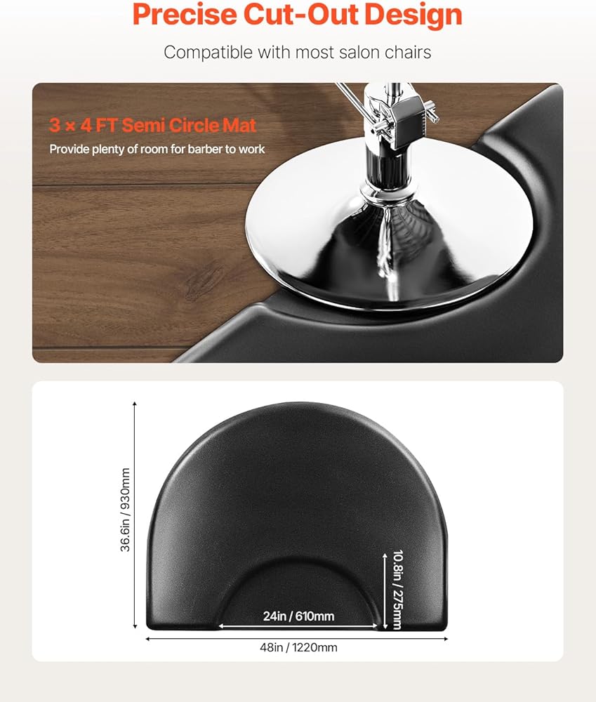 ملاءمة مثالية: توفر سجادة الصالون شبه الدائرية مقاس 3 × 4 أقدام لمصففي الشعر مساحة واسعة للوقوف، مما يسمح للحلاقين بالتحرك بحرية والعمل بكفاءة أكبر. مقاس 24.0 × 10.8 بوصة (610 × 275 مم) يناسب معظم كراسي الصالون ذات القاعدة المستديرة، ويبقى ثابتًا في مكانه دون تغيير
