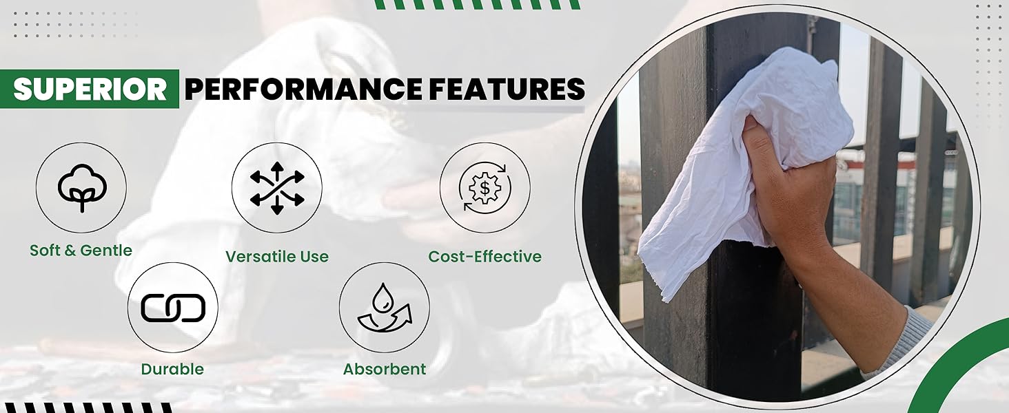 • ضرورية لمكان العمل - هذه الخرق القطنية للتنظيف مثالية لكل مهمة، بدءًا من تلطيخ الخشب وحتى صيانة الآلات. سواء كنت بحاجة إلى قطعة قماش بيضاء للتنظيف، أو منشفة تي شيرت متعددة الاستخدامات، أو قطعة قماش متينة للمتجر، فهي ضرورية لأي مساحة عمل!