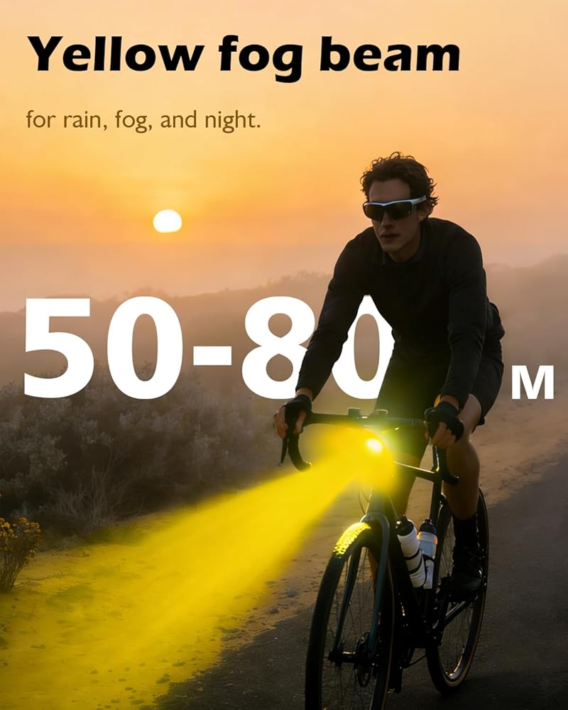 • 【رؤية ضوء الضباب ومقاومة جميع الأحوال الجوية IPX6】 تم تصميم وضع ضوء الضباب المدمج للطقس غير المتوقع، ويخترق 50-80 مترًا من خلال الضباب الخفيف والضباب، مما يعزز رؤيتك بشكل كبير لحركة المرور القادمة. بفضل تصنيف IPX6 القوي المقاوم للماء، فإن هذا الضوء محمي بالكامل ضد المطر الغزيرة ورذاذ الطين. سواء كان صباحًا ضبابيًا أو ليلة عاصفة، يمكنك الركوب بثقة مع العلم أن طريقك يظل مرئيًا وأن معداتك محمية.