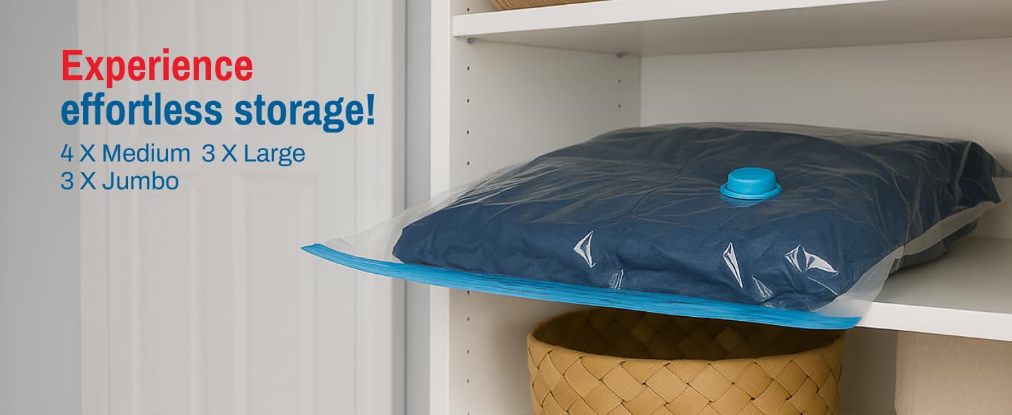 • سهلة الاستخدام مع أي مكنسة كهربائية: متوافقة مع مضخة التفريغ اليدوية. ما عليك سوى ملء الحقيبة، وإغلاقها، وتفريغ الهواء، وستكون جاهزًا - مثالية للسفر أو التخزين المؤقت أو طويل الأمد.