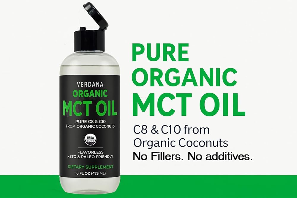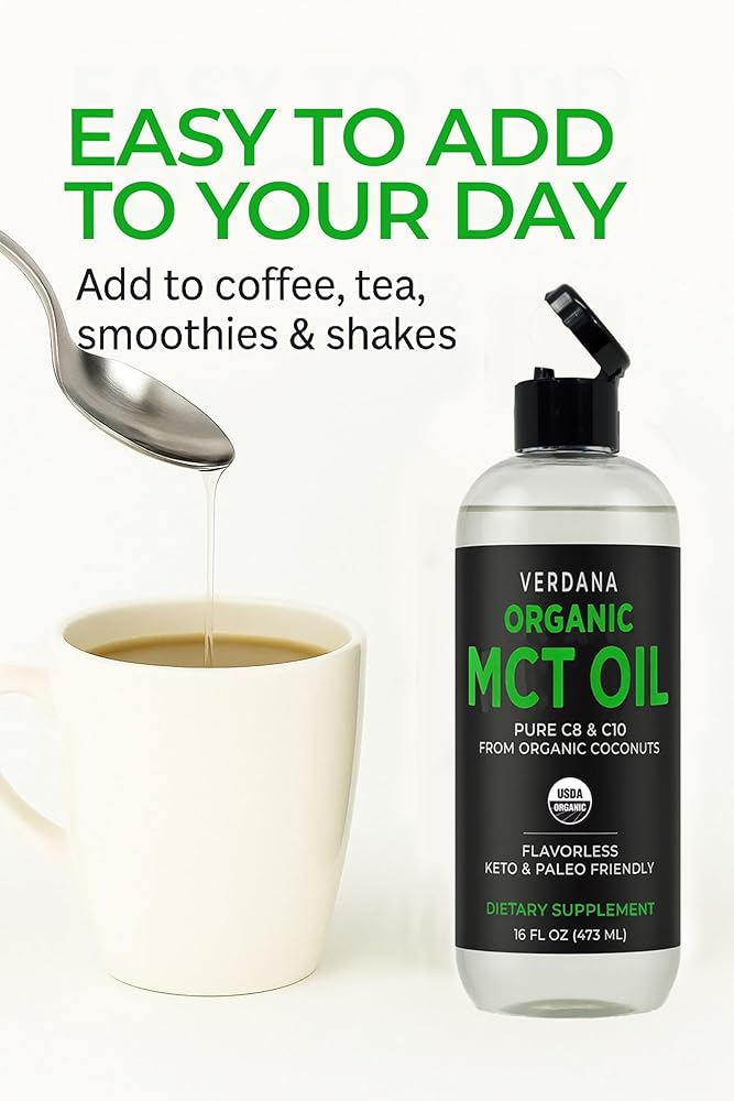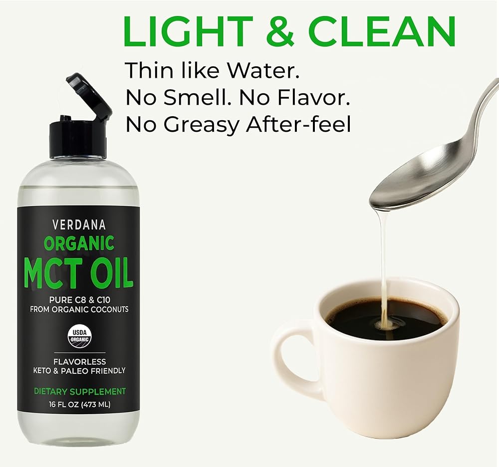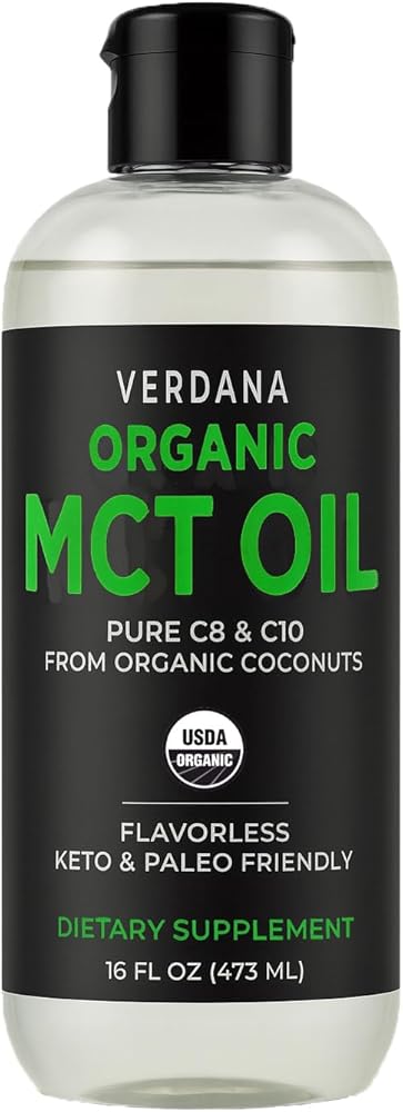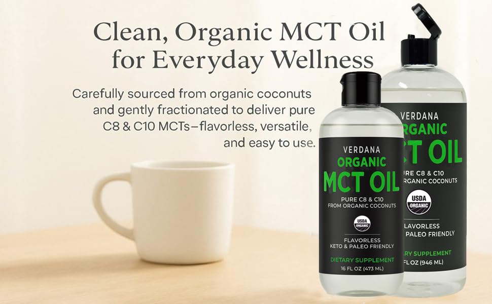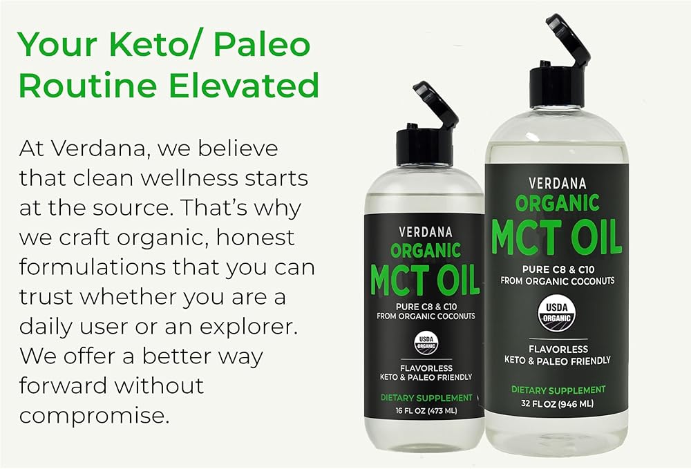 زيت MCT العضوي من Verdana، 16 أونصة سائلة - نقي C8 وC10 من جوز الهند العضوي، زيت MCT غير منكه للقهوة، صديق للكيتو، بدون زيت النخيل، مكمل غذائي