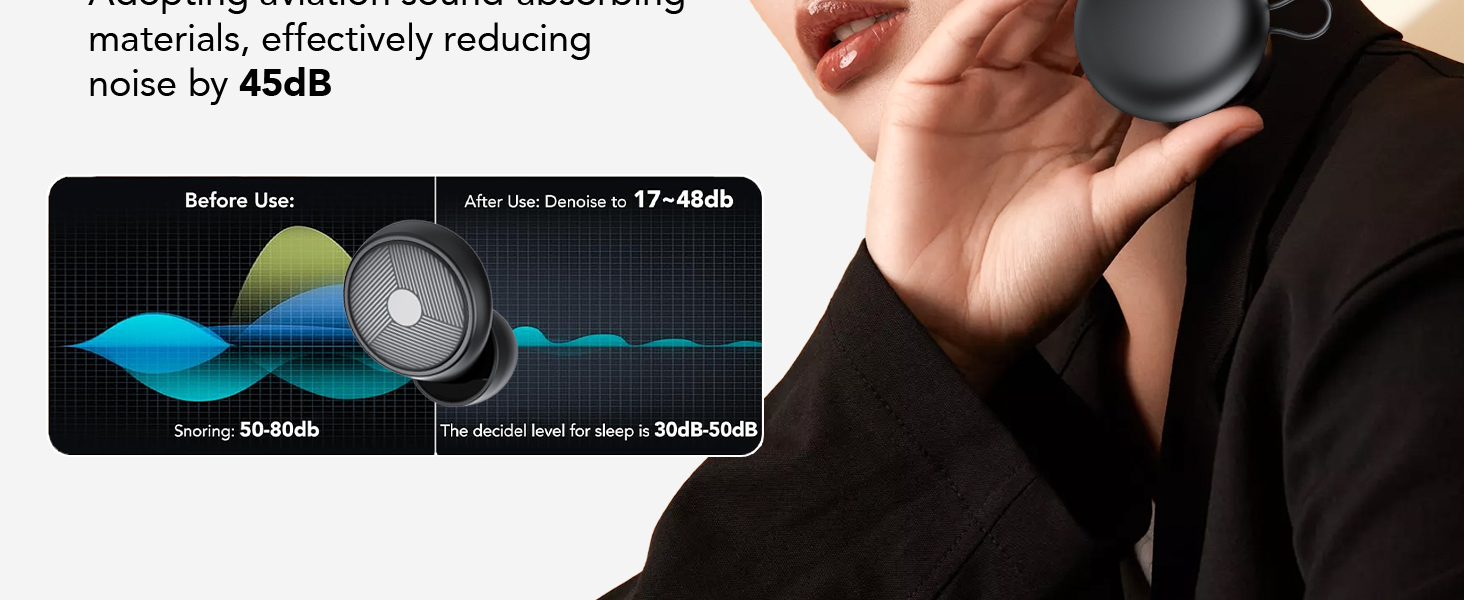 • سدادات أذن لتقليل الضوضاء بمقدار 45 ديسيبل: تعتمد سدادات الأذن أثناء النوم تقنية عزل الصوت المتقدمة ومطعمة بمرشحات تخفيف جسيمات النانو بوليمر متعددة الطبقات لتقليل الضوضاء، والتي تعكس وتمتص الموجات الصوتية بشكل فعال لتحقيق تقليل الضوضاء حتى 45 ديسيبل، وتصفية 90% من الضوضاء، ويمكن أن تقلل من الديسيبل الضارة لحماية أذنيك في البيئات الضوضاء.