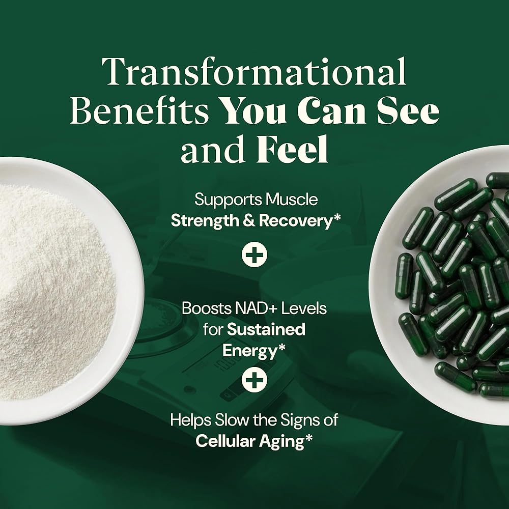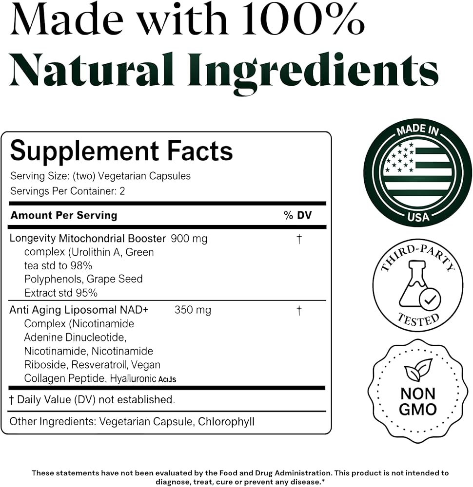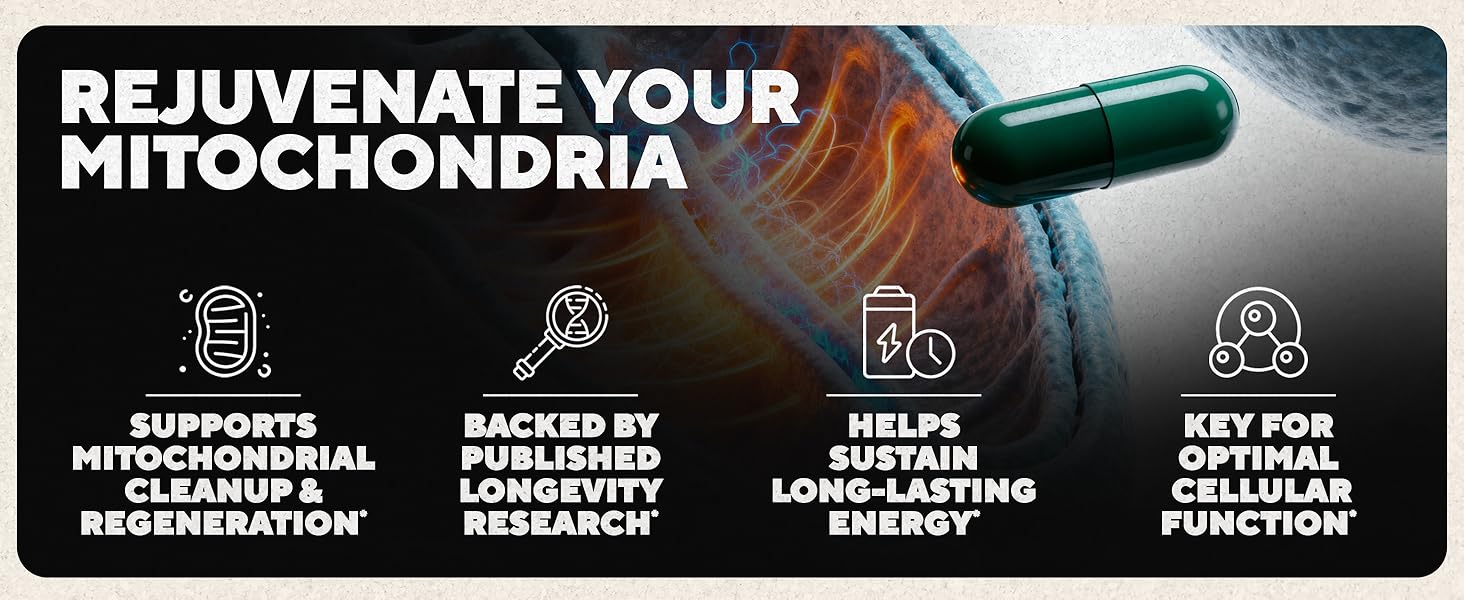 𝐃𝐔𝐀𝐋-𝐏𝐀𝐓𝐇𝐖𝐀𝐘 𝐋𝐎𝐍𝐆𝐄𝐕𝐈𝐓𝐘 𝐒𝐔𝐏𝐏𝐎𝐑𝐓 — يجمع سلائف Urolithin A وNAD+ تستهدف الحيوية الخلوية من زاويتين: تعزيز الميتوفاجي (التجديد الخلوي) وطاقة الميتوكوندريا لوظيفة الشباب والقدرة على التحمل.*