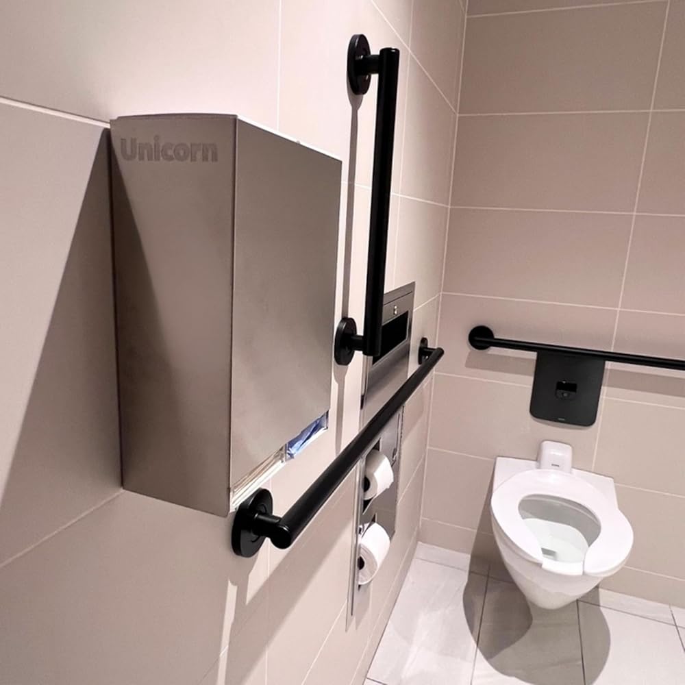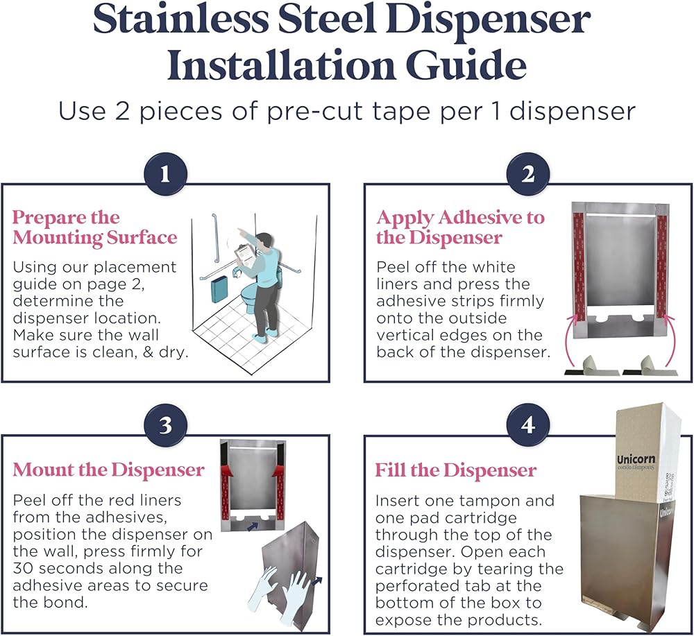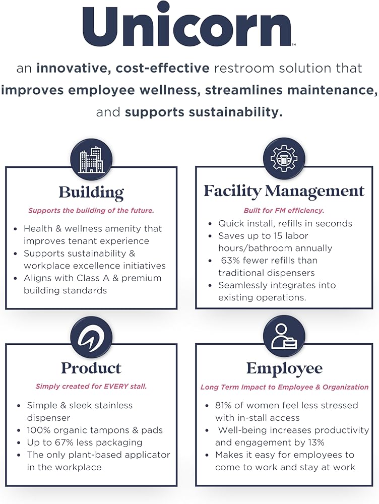 "Upgrade your restroom standard with UNICORN's stainless steel in-stall period care dispenser —designed to make period products work like toilet paper: simple, consistent, and always where they're needed. Built for commercial environments, this sleek dispenser mounts quickly and supports fast, hygienic refills using UNICORN's cartridge system. Key Benefits: In-stall access (not on the counter or in the common area) Stainless steel finish for a clean, modern look Fast refill cartridge system (pads + tampons) Designed for offices, schools, hospitality, and high-traffic restrooms Supports a consistent restroom standard across locations Note: UNICORN pad and tampon cartridges sold separately."