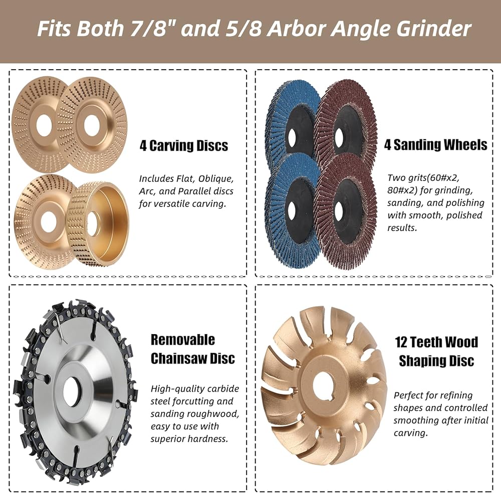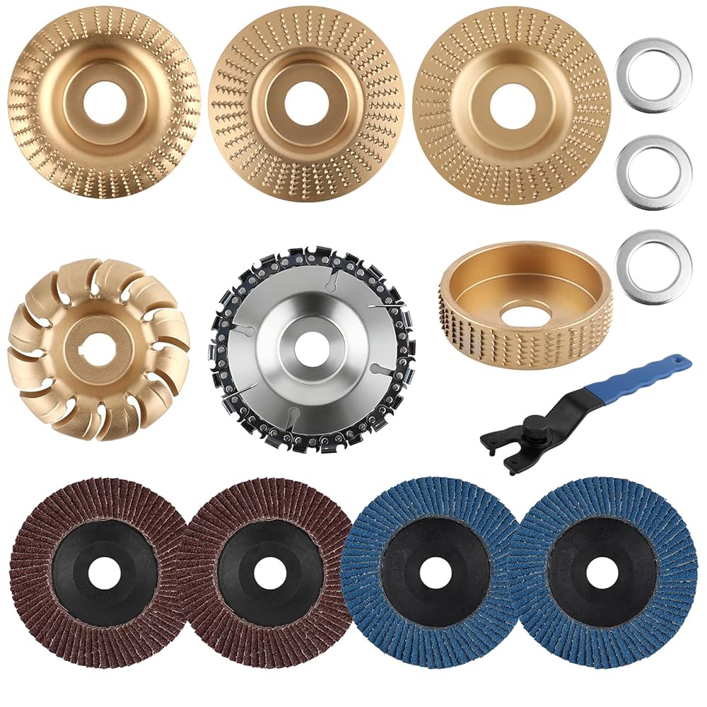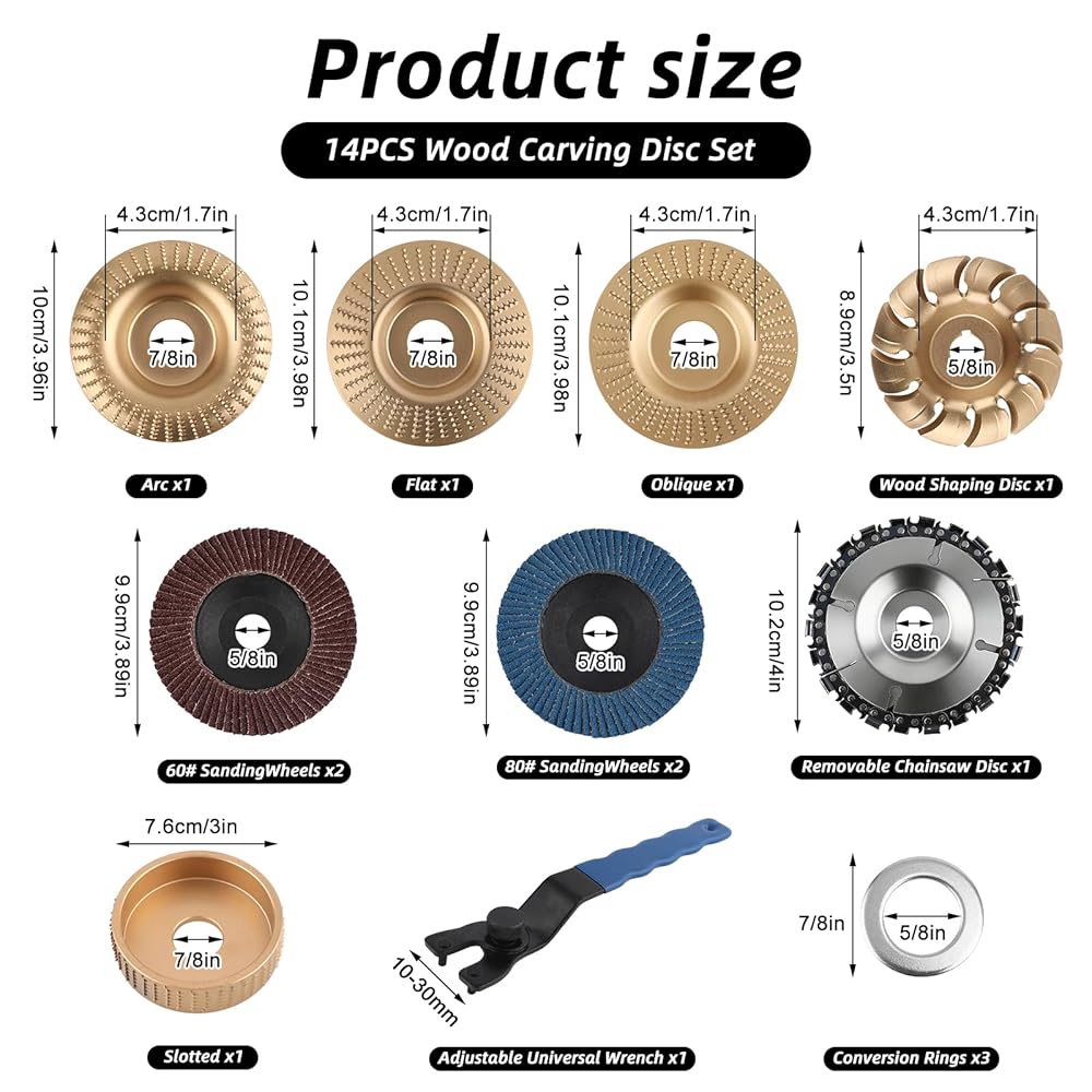 Complete 14-Piece Set & Specifications: The wood working tools and accessories include 4 upgraded grinding wheels (right-angle flat, curved, flat, beveled), 1 chainsaw disc, 1 shaping disc,2 x 60-grit red flap sanding wheels, 2 x 80-grit blue flap sanding wheels, 1 wrench, and 3 adapter rings (7/8" to 5/8").