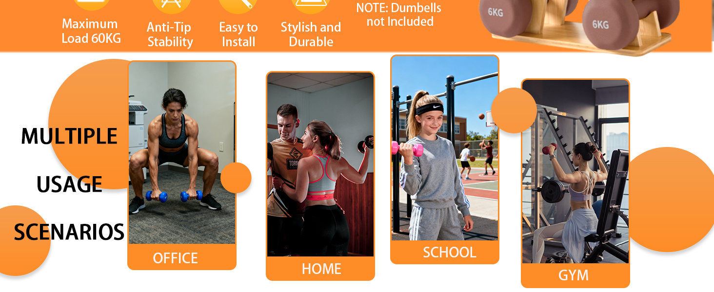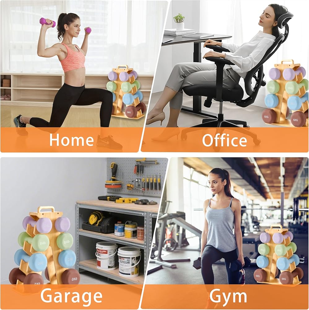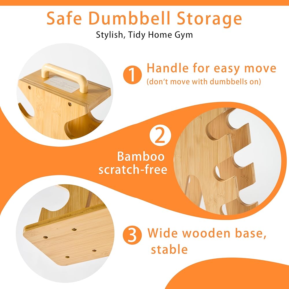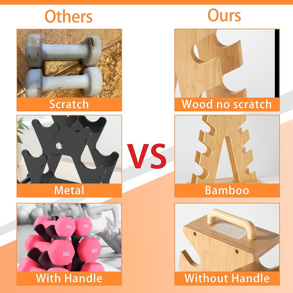 لا مزيد من الأرضيات الفوضوية أو الدمبل المخدوشة: تمنع الأوزان من التدحرج أو إتلاف الأرضيات. يساعد الهيكل الخشبي على منع الخدوش والرقائق والضوضاء مقارنة بالرفوف المعدنية التقليدية.