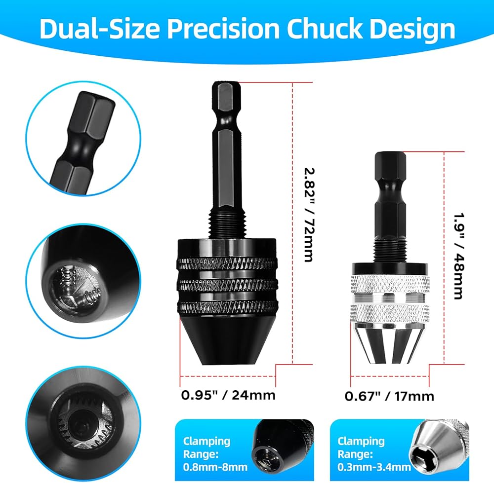 • Dual-Size Versatility: Two chucks for all needs: Black (0.8-8mm) handles heavy drilling in wood/metal, Silver (0.3-3.4mm) manages delicate tasks like jewelry repair.