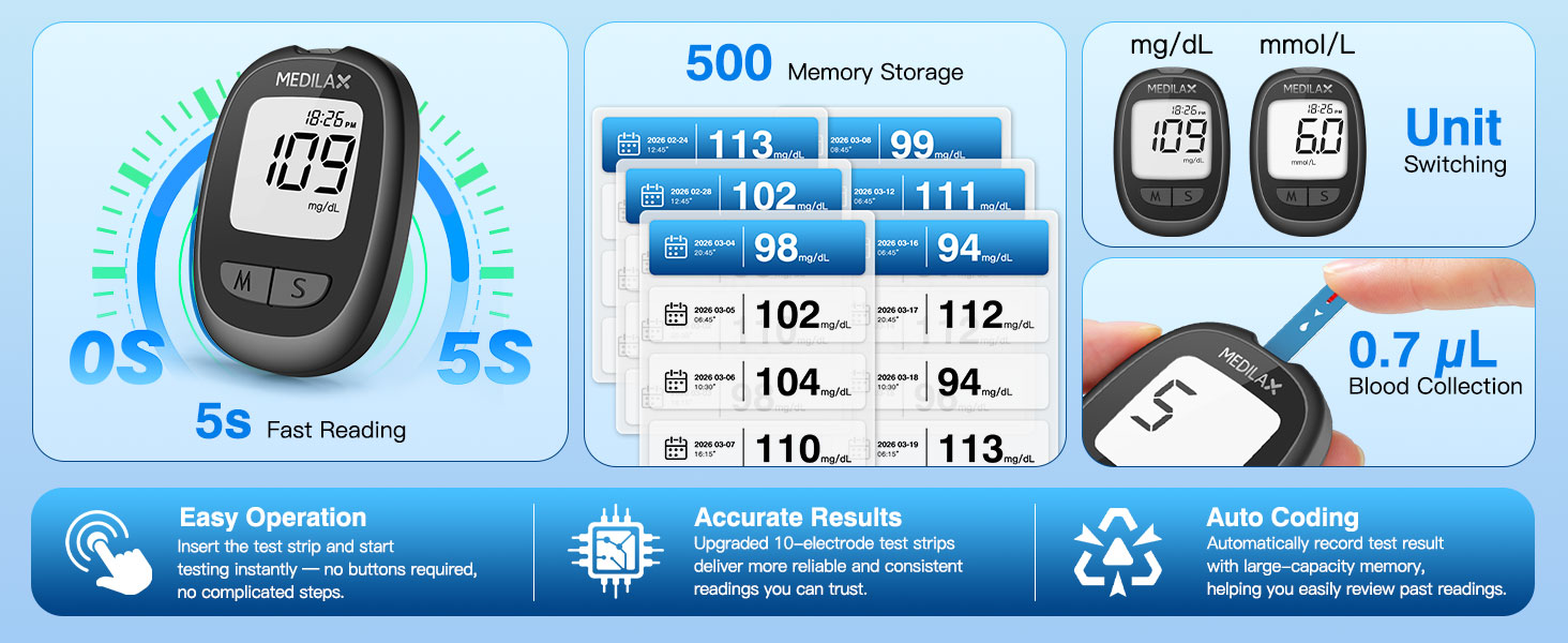 • تشغيل سهل: يتميز جهاز مراقبة الجلوكوز من Medilax بوظيفة تلقائية بدون تشفير. ما عليك سوى إدخال شريط اختبار Medilax لتشغيله وبدء الاختبار. بفضل شاشته الواضحة وتصميم إخراج الشريط بلمسة واحدة، أصبحت العملية بديهية ويمكن لجميع المستخدمين الوصول إليها، وخاصة كبار السن