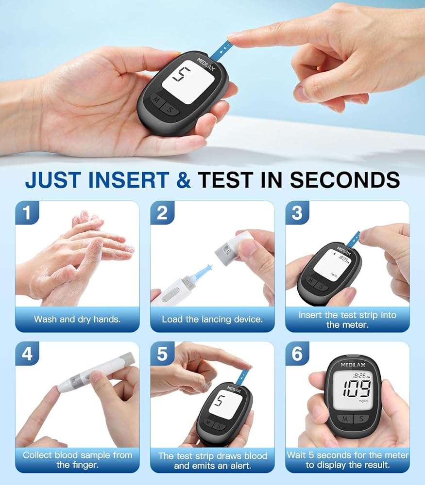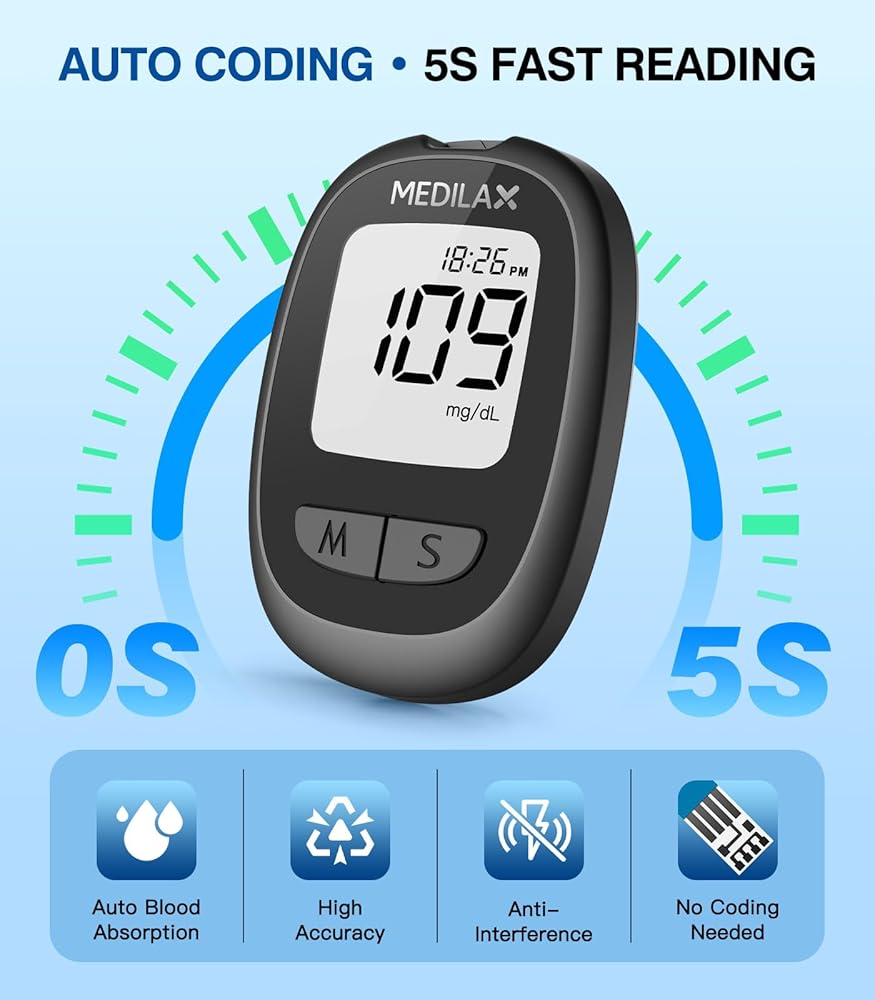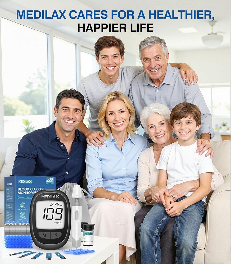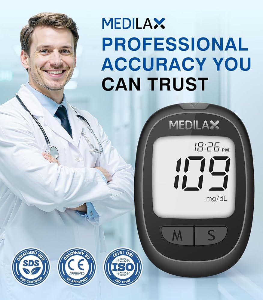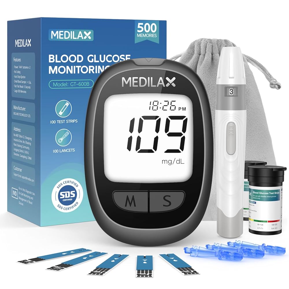 • مجموعة مراقبة الجلوكوز الكل في واحد: تشتمل مجموعة مراقبة نسبة الجلوكوز في الدم من Medilax على 1 × جهاز قياس السكر، و1 × جهاز وخز، و100 شريط اختبار، و100 × مشارط، ودليل مستخدم، وحقيبة تخزين محمولة. تشتمل هذه المجموعة الجاهزة للاستخدام على جميع الأساسيات لإجراء اختبار دقيق ومريح للجلوكوز، وهي مثالية للاستخدام اليومي أو المراقبة أثناء التنقل