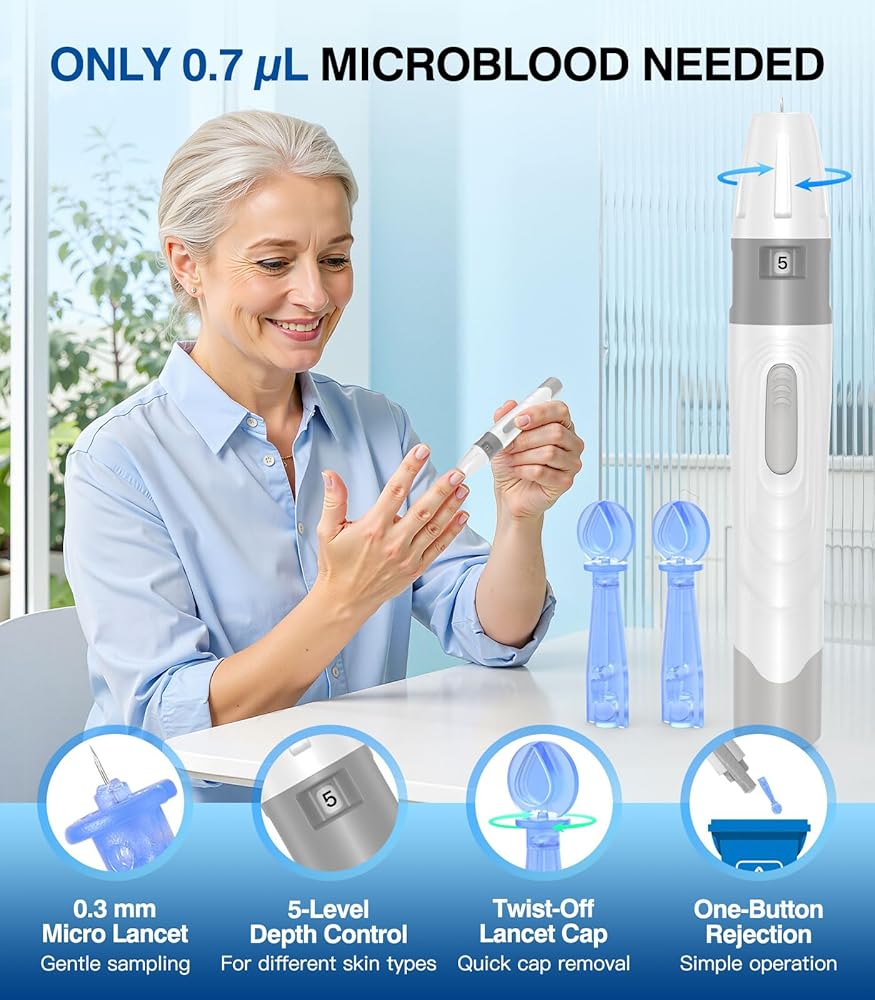• 5-النتائج الثانية: تتطلب مجموعة اختبار مرض السكري هذه 0.5 ميكرولتر فقط من الدم وتوفر قراءات دقيقة في 5 ثوانٍ فقط. كما أنه يتميز بشاشة عرض كبيرة وسهلة القراءة للحصول على رؤية واضحة للنتائج. يوفر جهاز الوخز 5 عمق قابل للتعديل ليناسب أنواع البشرة المختلفة. تجعل العملية السريعة واللطيفة الاختبار أقل ترويعًا، ومناسبة بشكل خاص للمستخدمين الذين يحتاجون إلى الاختبار بشكل متكرر