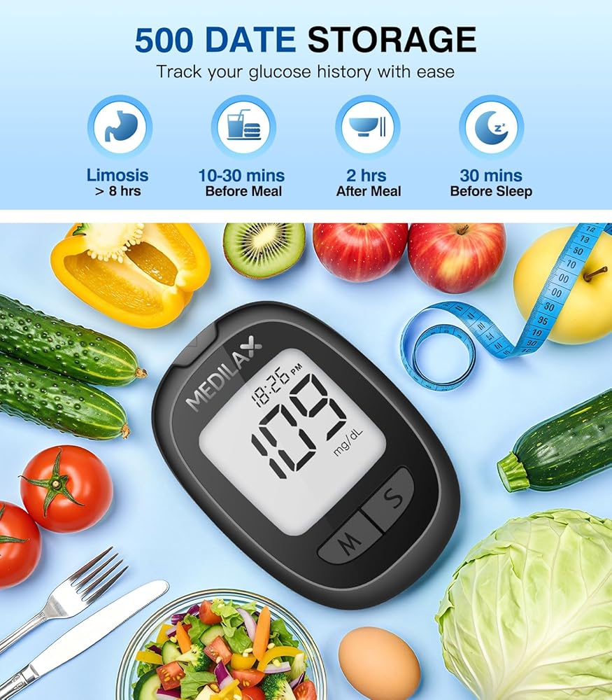 مجموعة مراقبة جلوكوز الدم من ميديلاكس، 100 شريط اختبار و100 مجموعة اختبار سكر الدم مع جهاز قياس السكر وجهاز الوخز، بدون ترميز، 500 جهاز مراقبة جلوكوز للتخزين للاستخدام المنزلي، واختبار مرض السكري