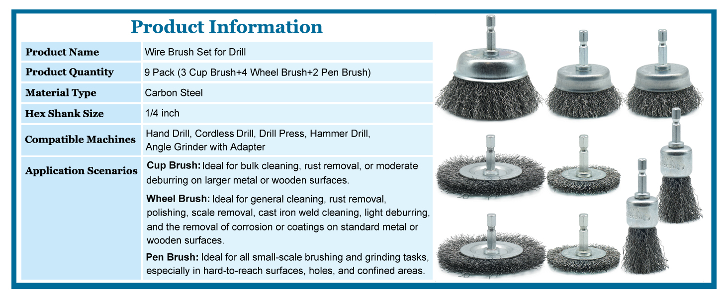 مصممة من أجل المتانة: مصنوعة من الفولاذ الكربوني الفاخر، ويتم تثبيت الشعيرات بشكل آمن تحت ضغط عالٍ. يقلل التصميم المنحني مسبقًا من تساقط الأسلاك ويعزز المرونة لإزالة الصدأ وتنظيفه للخدمة الشاقة