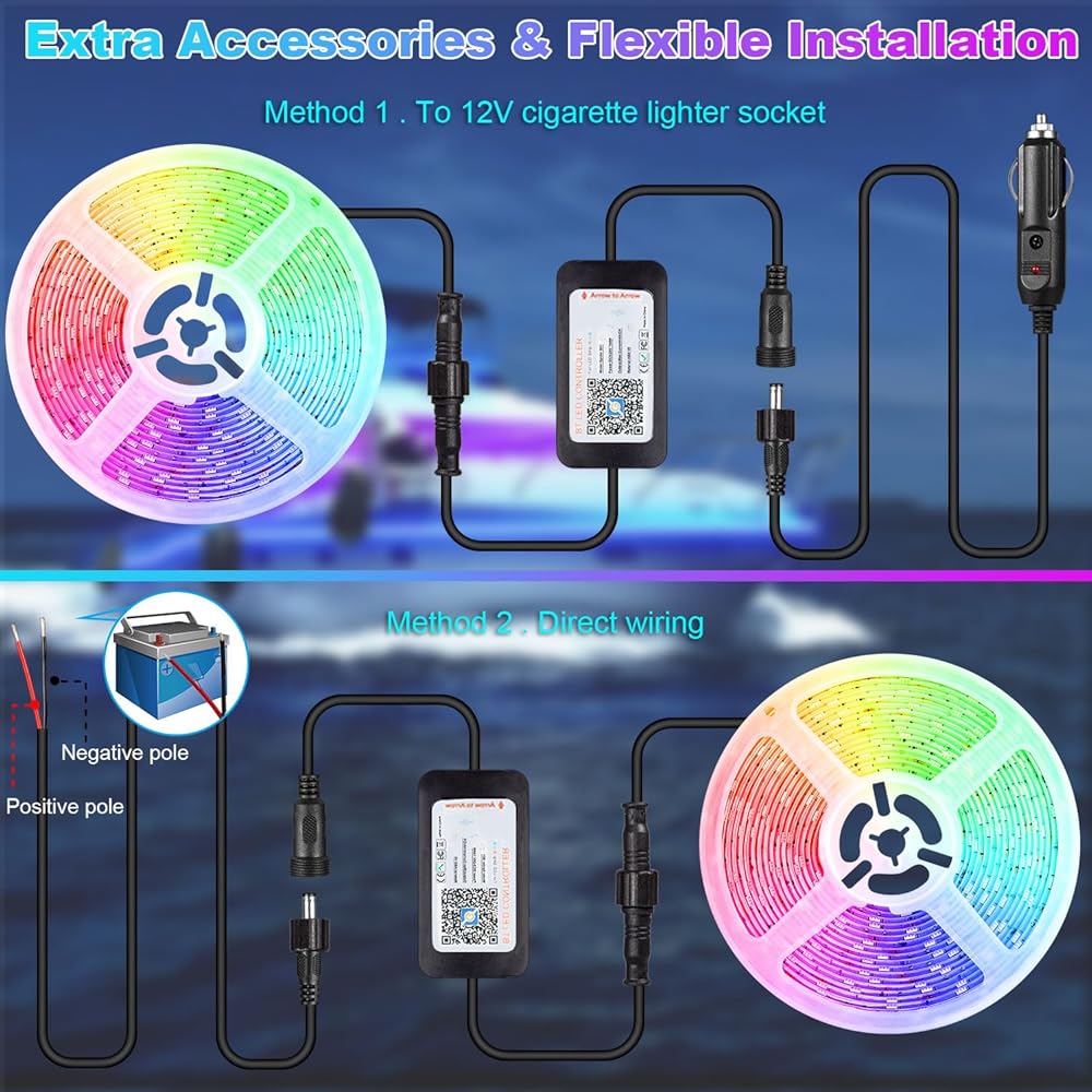 التثبيت بدون جهد مع الملحقات الإضافية: قم بتبسيط الإعداد باستخدام خيارات الطاقة المزدوجة: قم بالتوصيل والتشغيل عبر سلك ولاعة السجائر بطول 3.3 قدم أو السلك الصلب باستخدام سلك التيار المستمر المقاوم للماء بطول 6.6 قدم مباشرة إلى بطارية 12 فولت. معززًا بدعامة ذاتية اللصق ومشابك تثبيت ومسامير، يبقى شريط الإضاءة LED 12 فولت ثابتًا بشكل آمن حتى في المياه القاسية. تم تصميم كل مكون - من الموصلات إلى المشابك - للتركيب السريع والصلب، مما يضمن أن تتحمل أضواء القارب العائم الأمواج والطقس والمغامرة دون أي تنازلات