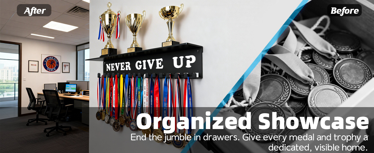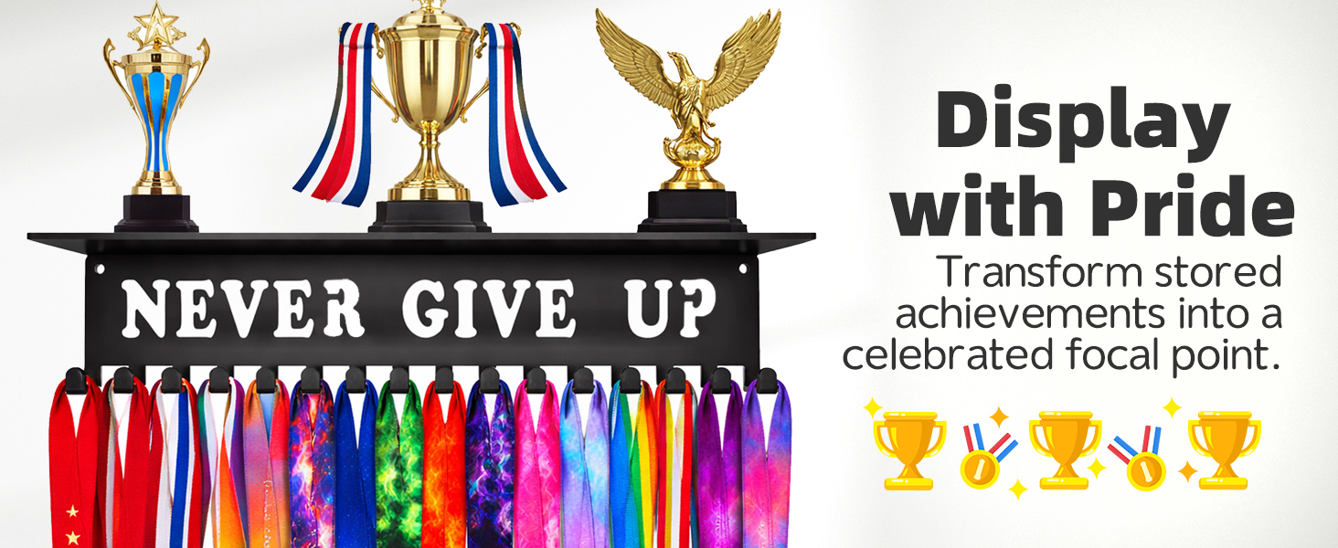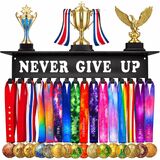 • لا تتخلى أبدًا عن اللافتات اختيار الشعار البسيط لا تتخلى أبدًا عن العديد من المواد التحفيزية لتزيين شماعة الميداليات الخاصة بنا. رغم بساطته وقوته في تشجيع الذات. نأمل أن لا يقوم كل عميل بعرض جوائزنا في مكان بارز فقط لتذكر الأوسمة الماضية ولكن أيضًا أن يظل هناك لتحقيق المزيد والتفاؤل بالمستقبل. فقط ضع رف الميداليات التحفيزي في مدخل منزلك وكرر ذلك لنفسك كل يوم! سوف تصبح حقا نسخة أفضل من نفسك!