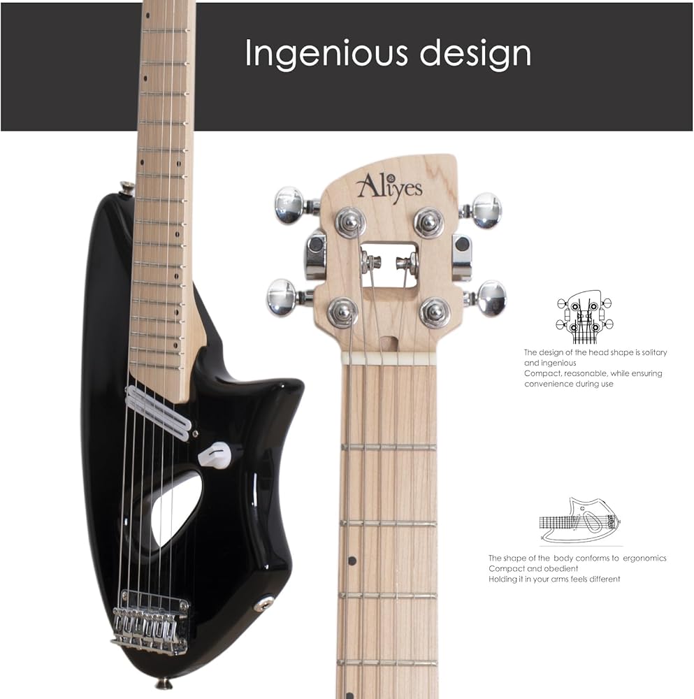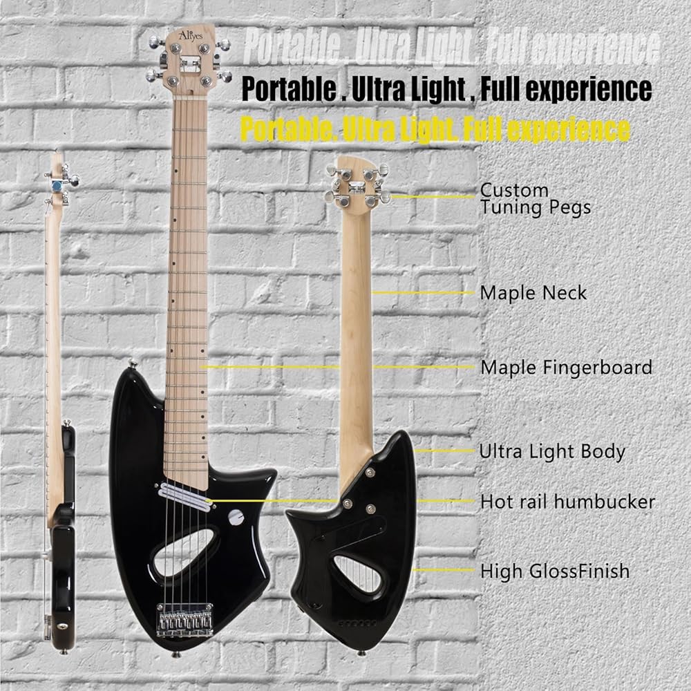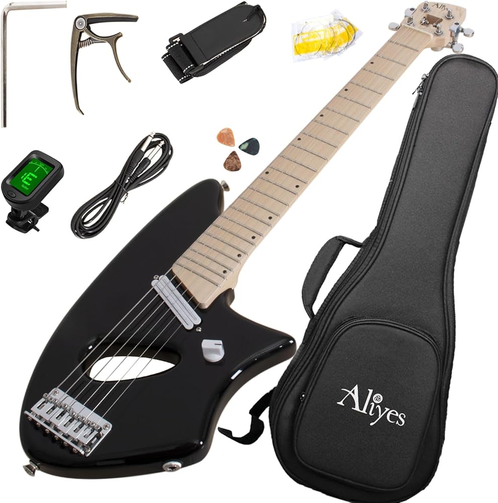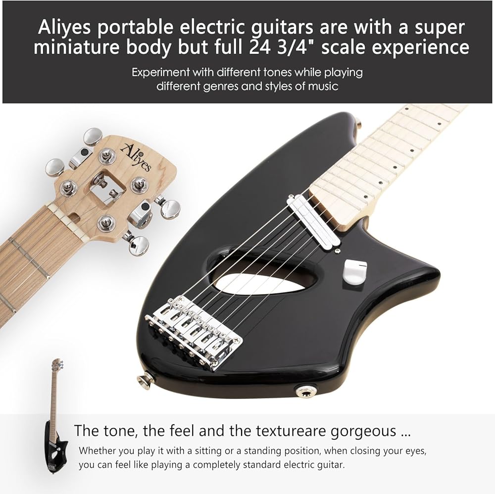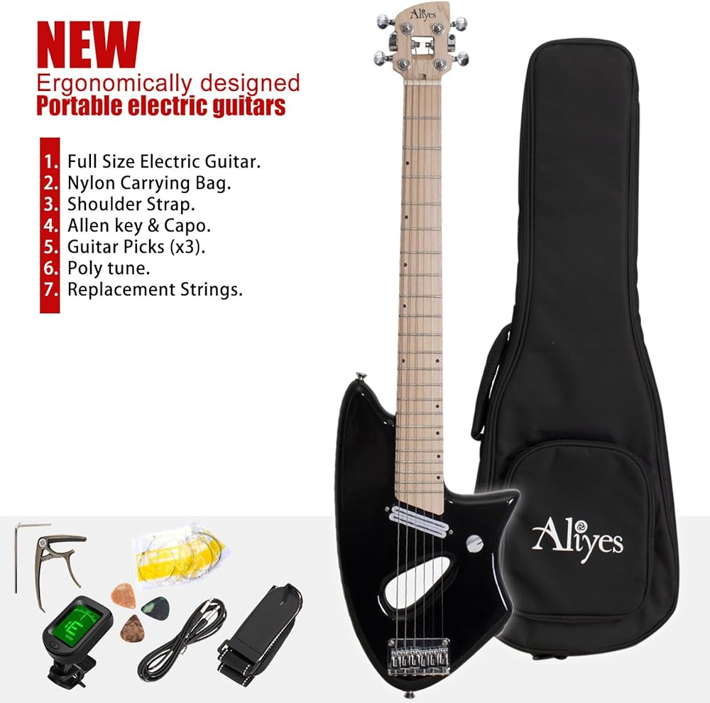 Aliyes جيتار كهربائي خفيف للسفر، مقياس كامل 24 75 بوصة للتمرين، محمول صغير الحجم ضوء ريشة الجيتار، حقيبة أزعج الجسم من الخشب الصلب، جميع الملحقات (أسود)