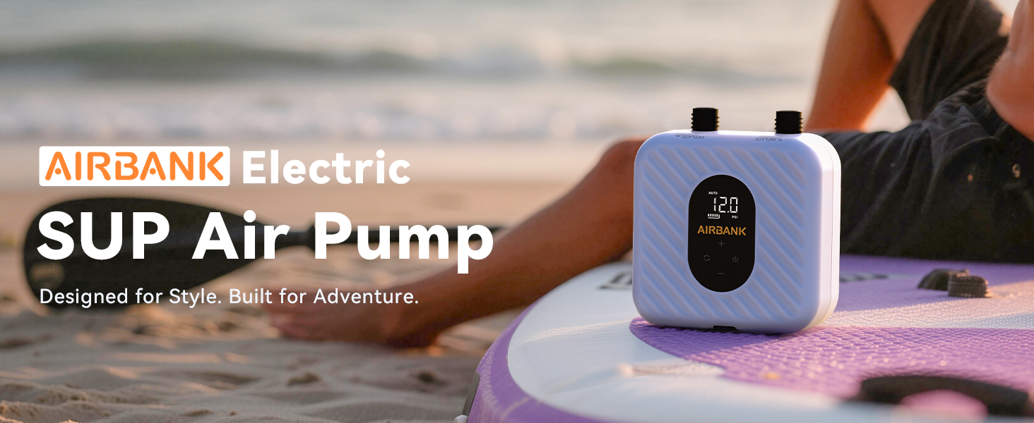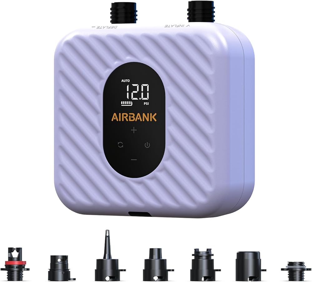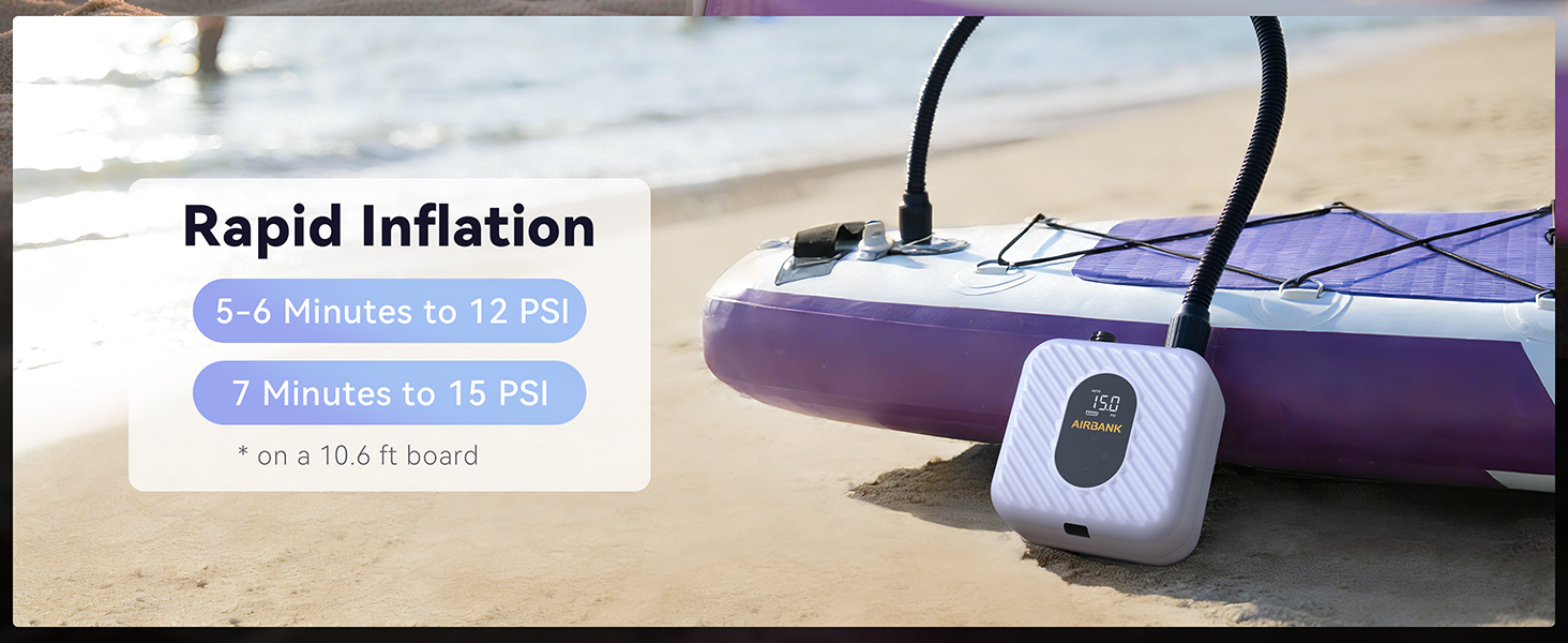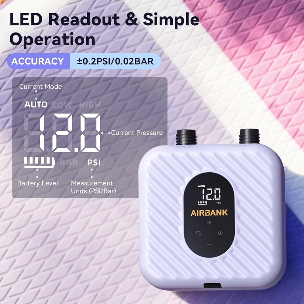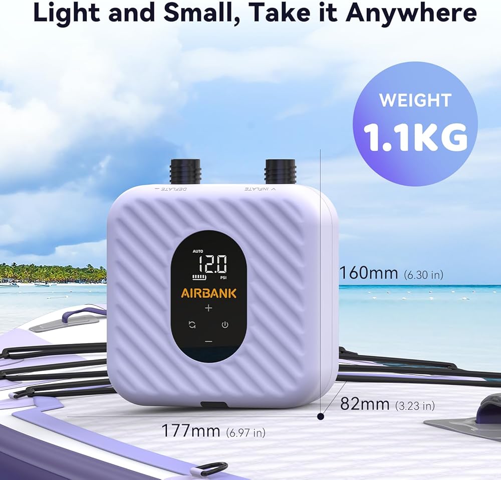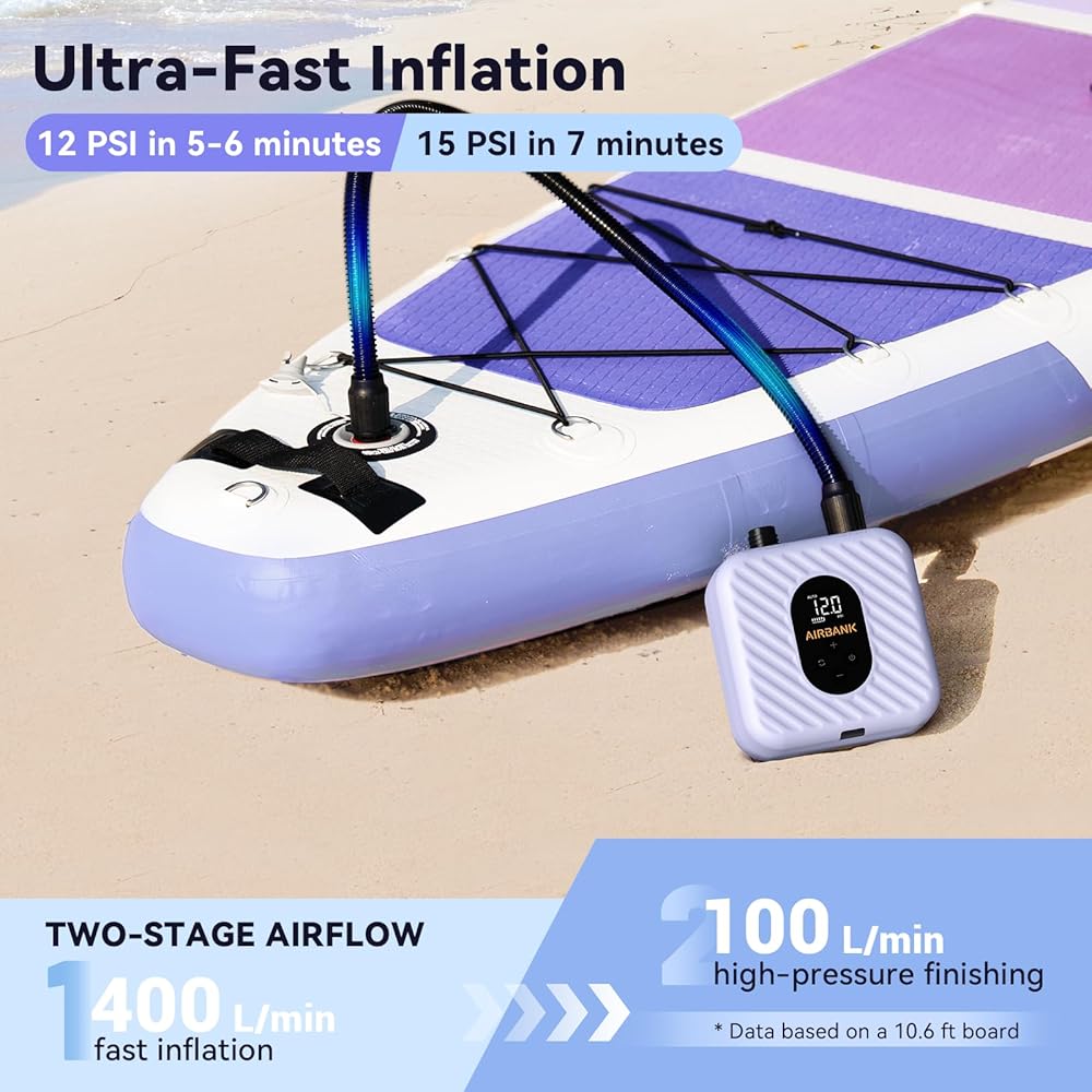 مضخة لوح مجداف قابلة لإعادة الشحن من AIRBANK، مضخة SUP كهربائية، بطارية 38.5 وات في الساعة، 20 رطل لكل بوصة مربعة، نفخ سهل ومضخة هواء خفيفة الوزن ذات ضغط عالي مزدوج المرحلة لقوارب الكاياك وأجنحة الطائرات الورقية والقوارب القابلة للنفخ