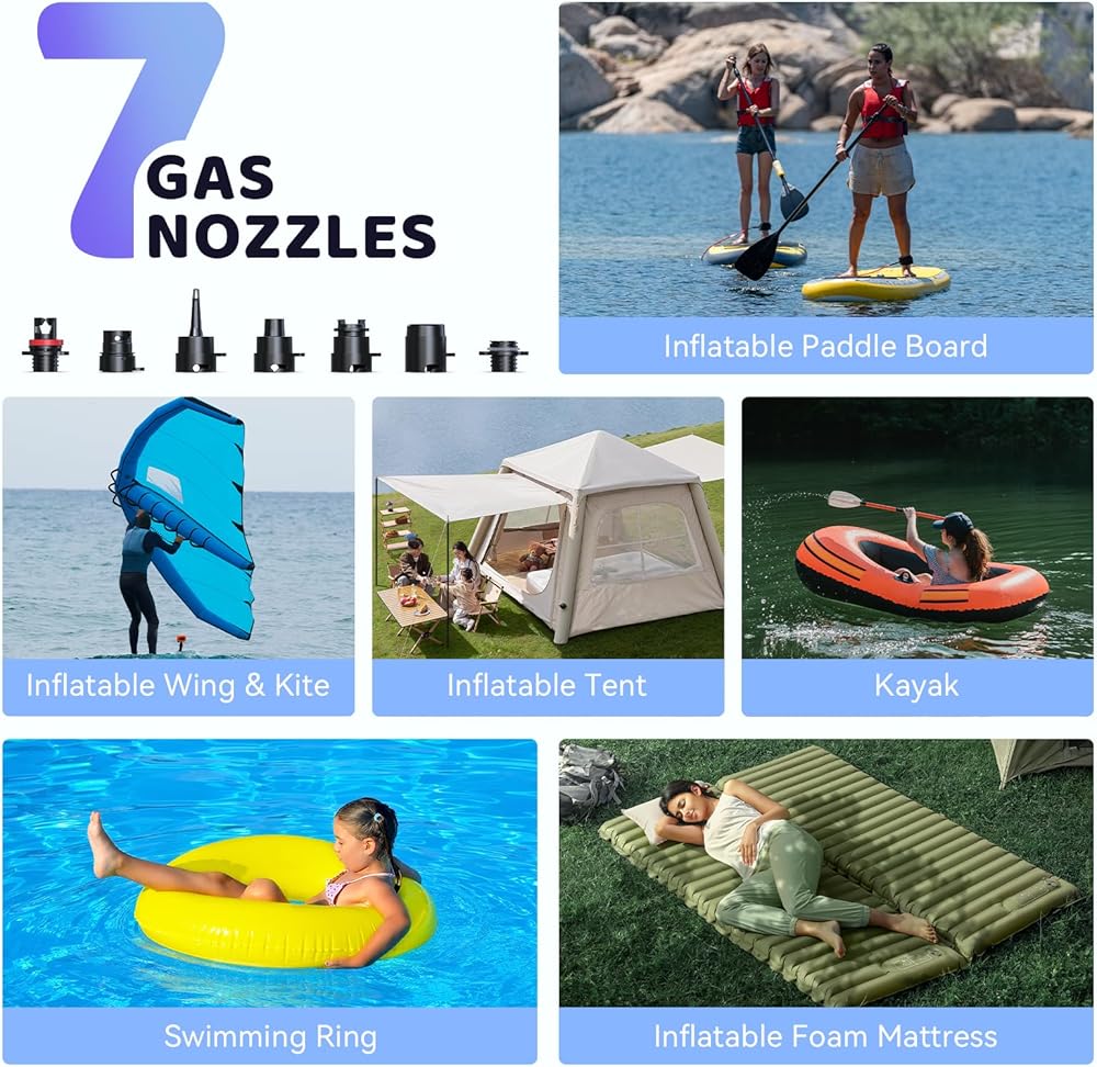 【7 فوهات لمختلف المواد القابلة للنفخ】توجد مجموعة كاملة من 7 فوهات تأتي مع مضخة SUP القابلة لإعادة الشحن. تناسب الفوهات المختلفة مختلف أنواع المطاطية، مثل أجنحة الطائرات الورقية، وقوارب الكاياك، والمواد المطاطية، والقوارب، والخيمة، وما إلى ذلك.