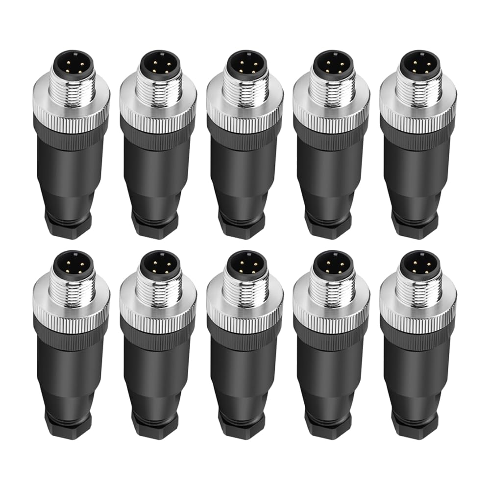 المواصفات الأساسية والحزمة: 10 قطع موصلات M12 قابلة للتجميع الميداني في كل حزمة، رمز A، 5 دبابيس، غير محمي، تصميم Male Right Angel. يتميز بوصلة لولبية وتصنيف IP67 لمقاومة الماء، وتركيب لوحات مقابس صناعية دائرية مقاس 12 مم
