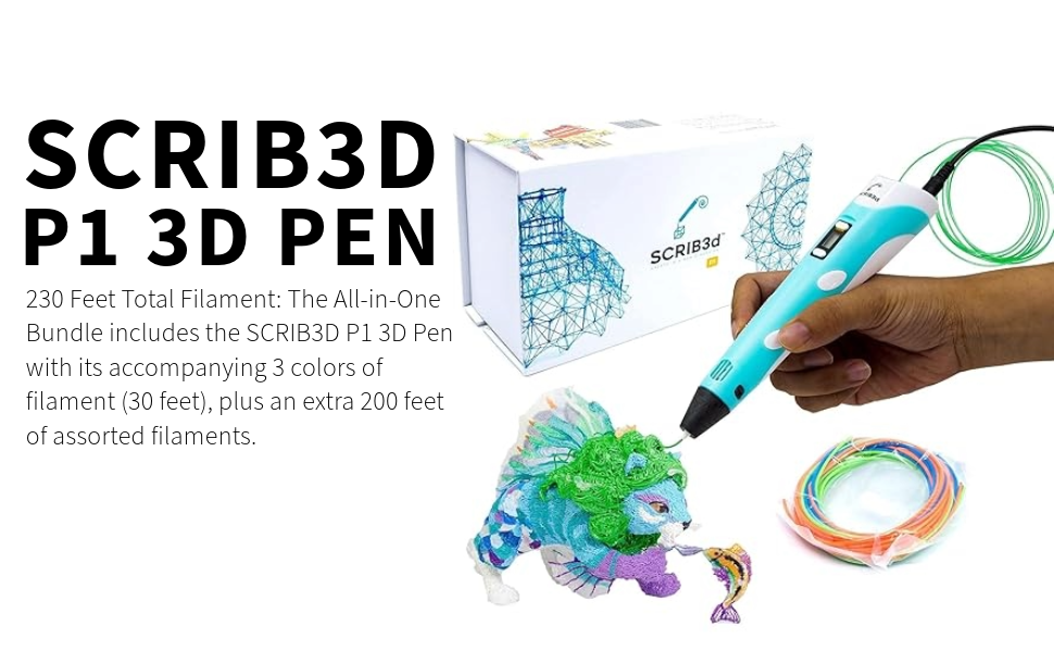 خيوط إجمالية بطول 230 قدمًا: تشتمل الحزمة الشاملة على قلم SCRIB3D P1 ثلاثي الأبعاد مع 3 ألوان مصاحبة من الخيوط (30 قدمًا)، بالإضافة إلى 200 قدم إضافية من الخيوط المتنوعة.
