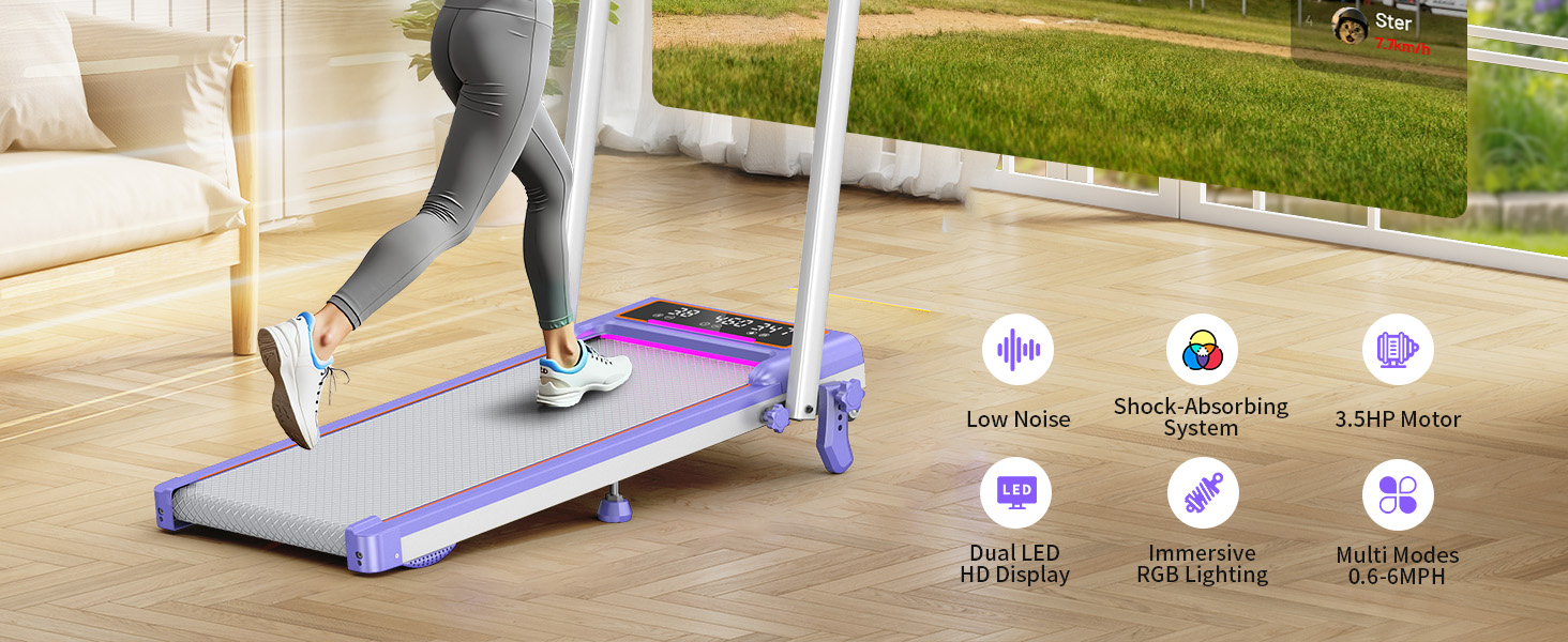 【إضاءة RGB ديناميكية لتنشيط كل جلسة】تعمل أجهزة المشي المنزلية على رفع مستوى تمرينك باستخدام شرائط إضاءة RGB المدمجة التي تغير الألوان وفقًا لسرعتك. تؤدي كل وتيرة إلى لون مختلف، مما يحول جريك إلى نشاط تحفيزي وجذاب بصريًا. مثالي للمستخدمين الذين يستمتعون ببيئة تمرين شخصية وحيوية - قم بمطابقة الجري مع إيقاعك!