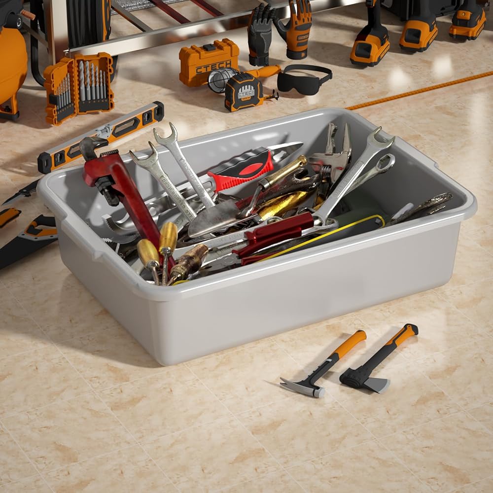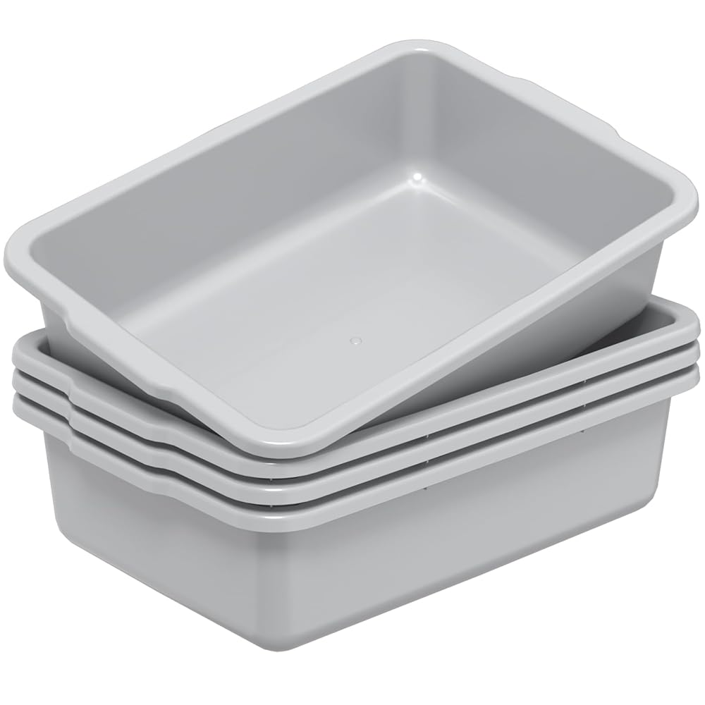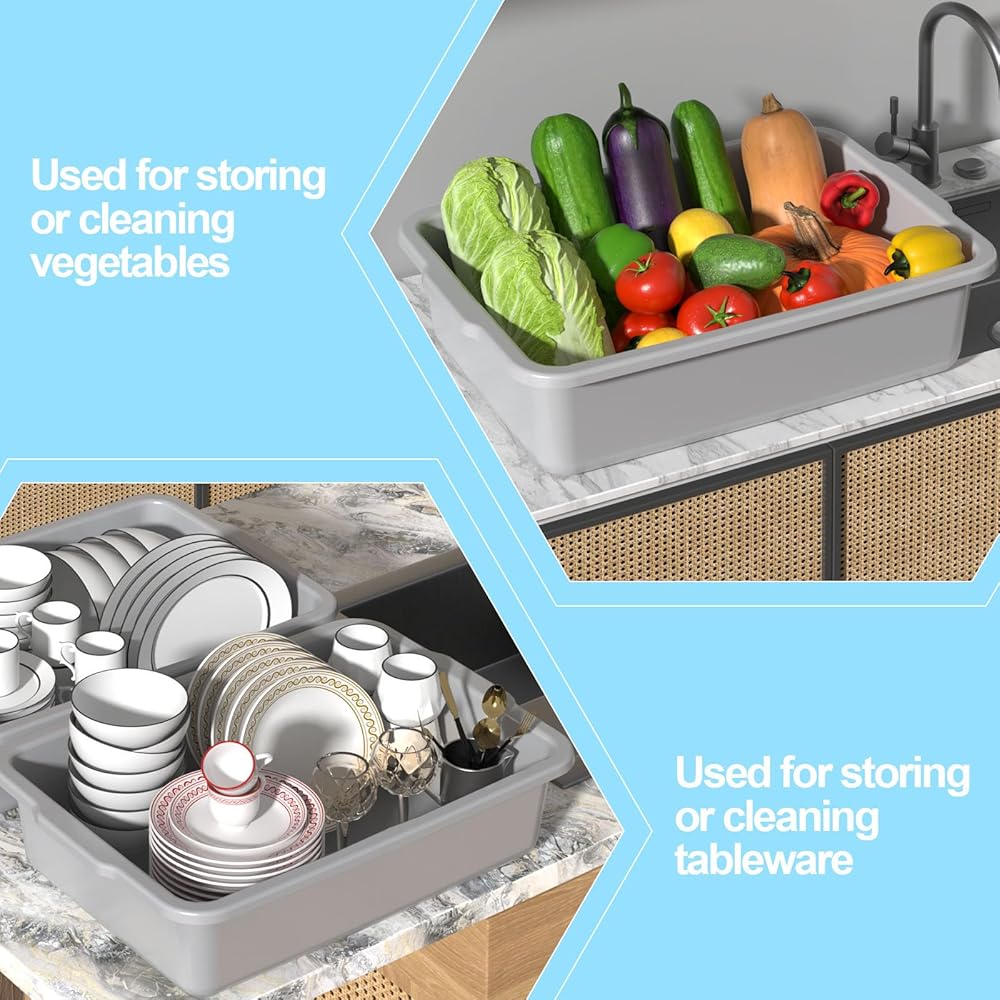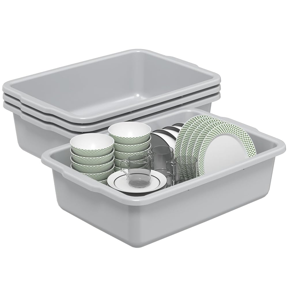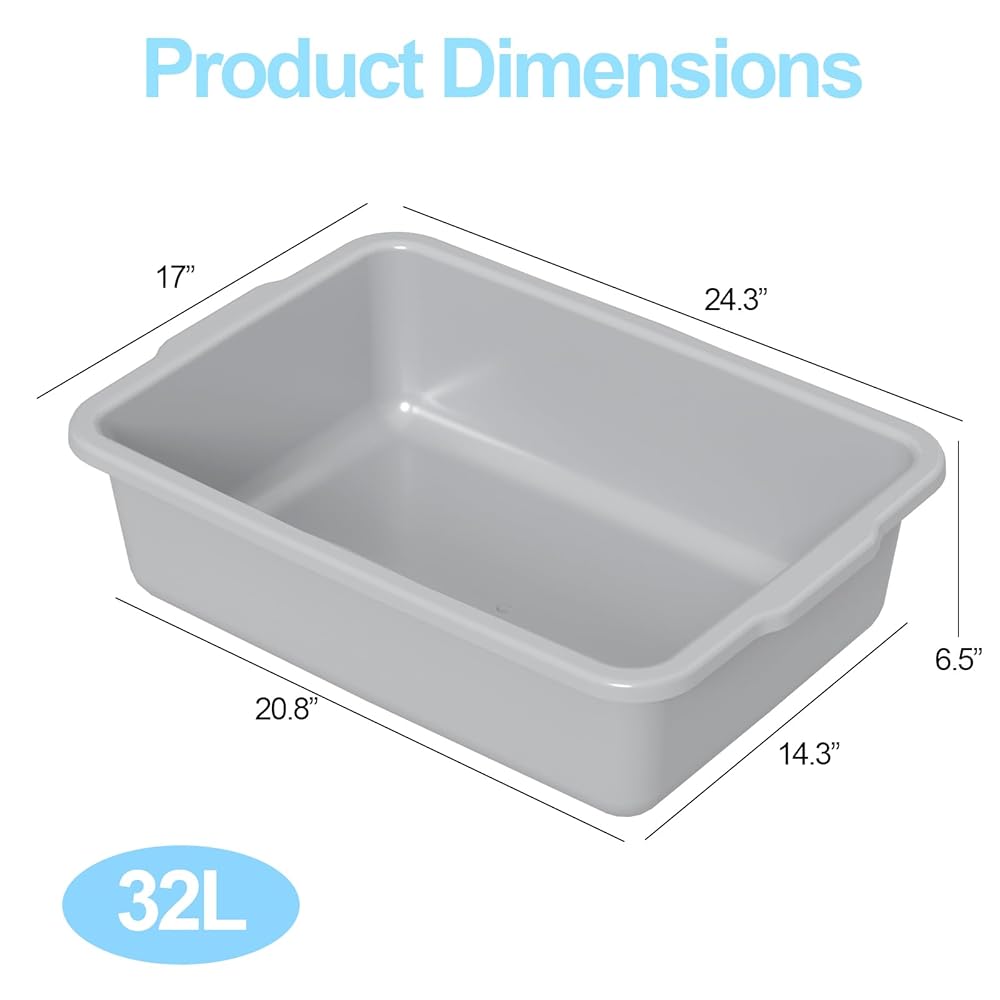 These are good products for commercial use, 4 pack 32 l large bus tubs in gray, size: 24.3 in x 17 in x 6.5 in, perfect for use in restaurants, hotels, bars, canteens, coffee shops, food processing plants, vegetable gardens, and more