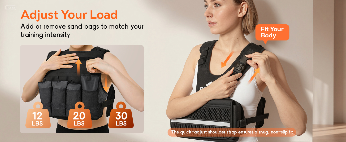 1. Customizable Weight & Ergonomic Fit: Adjustable from 1–12 /1-20/1-30 lbs with 8 removable sandbags; U-shaped ergonomic design for shoulder comfort.