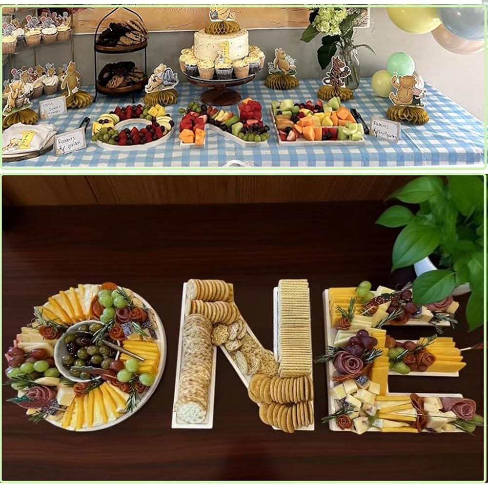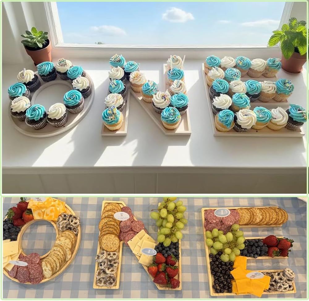 • زخرفة متعددة الوظائف: يمكن أن تكون حروف لوحة تشاركوتيري للأطفال هذه بمثابة عناصر تزيينية وصواني وظيفية للبسكويت والحلوى؛ يمكن ملء الصواني الخشبية للطعام بالطعام اللذيذ لترفيه ومفاجأة الضيوف، مما يضيف المزيد من العناصر التفاعلية إلى ديكور الحدث.
