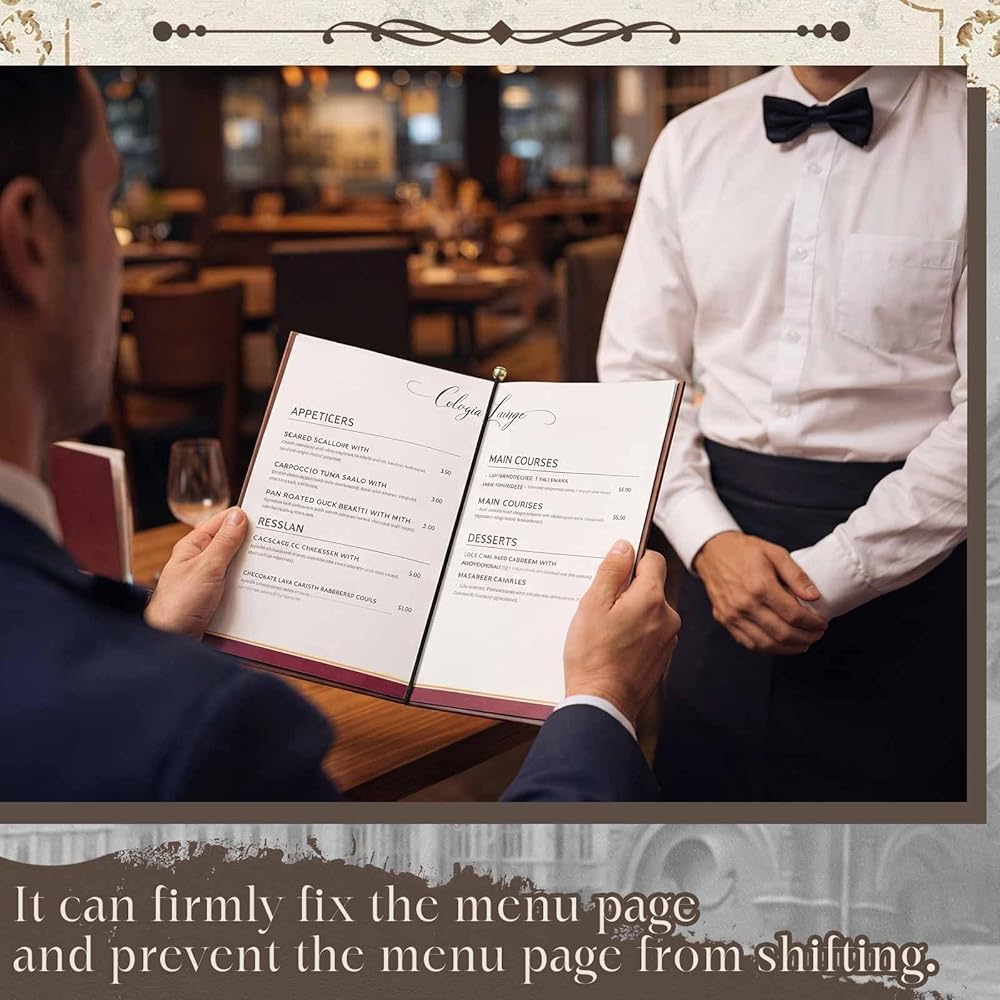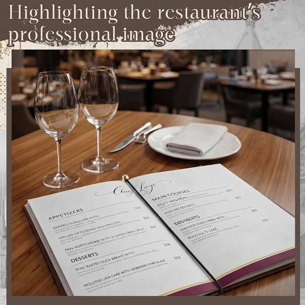 Exquisite details: The black elastic menu band cord with sturdy metal buckles at both ends not only enhance the product's durability, but their simple metallic sheen, paired with the black elastic band, adds a touch of understated professionalism, elevating the menu's class in the details