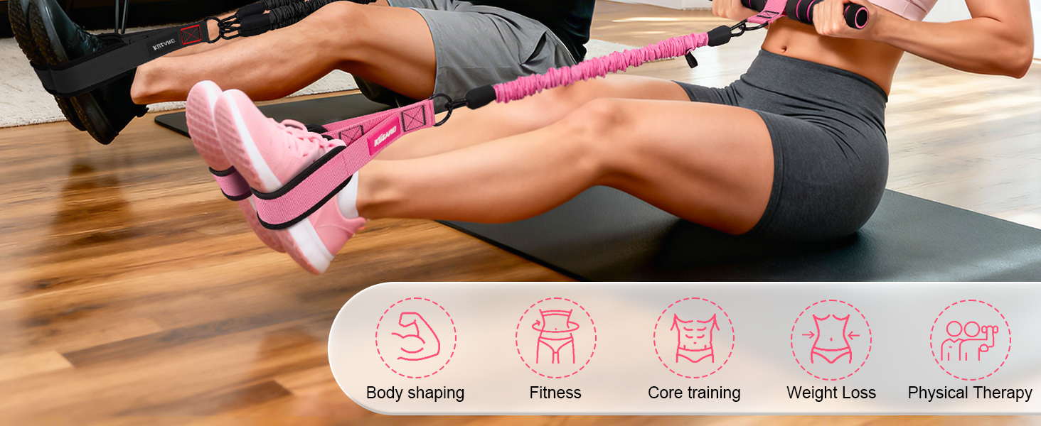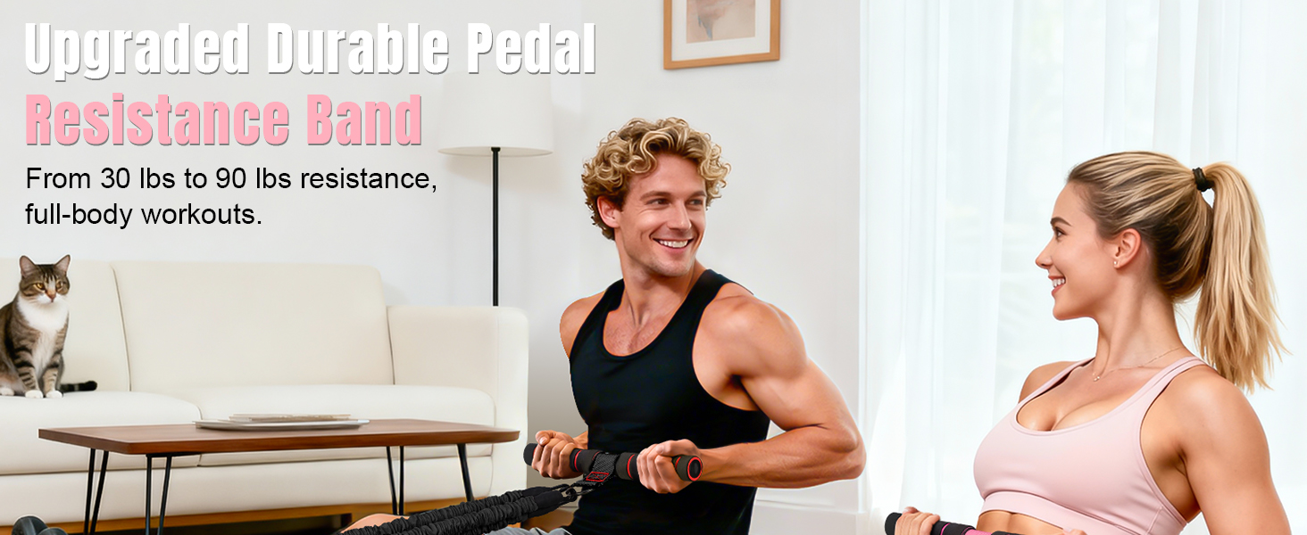 Designed for women who want simple and effective workouts at home, this multifunction pedal resistance band helps activate the core, arms, legs, hips, and waist in one routine. Just 10 minutes a day supports fat burning, body shaping, and muscle toning. Safety is a key priority. Unlike exposed resistance bands, this sit-up resistance band features natural latex tubes wrapped in a dual-layer protective sleeve. The sleeve helps reduce snap-back risk, improves durability, and provides greater confidence during daily workouts, especially for beginners and women. The adjustable resistance system adapts to different fitness levels. With three 30 lb bands that can be combined up to 90 lbs, one set grows with your strength and avoids the need for replacement as you progress. Comfort is built into every workout. The upgraded wide foot pedals use durable nylon fabric with a soft, cushioned, non-slip surface, reducing pressure on your feet and improving stability—even when training barefoot. Compact and portable, this all-in-one pedal resistance band combines foot pedal exercises, hand pull movements, and Pilates-style training into one space-saving set. It makes full-body workouts easier to maintain anytime, anywhere—no gym required.