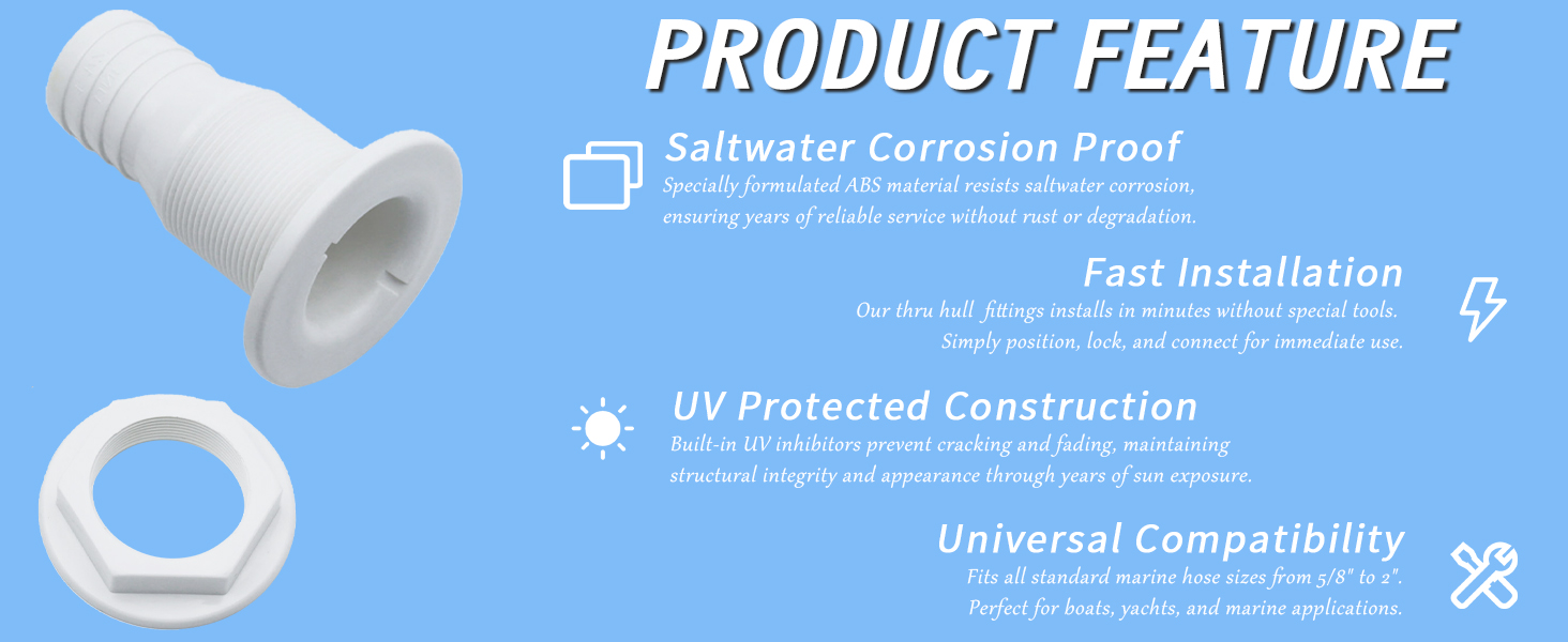 【HIGH QUALITY MATERIALS】Thru hull fitting is made of premium ABS material,sturdy and not easy to break,cannot rust and anti-UV,lightweight and impact-resistant.Thru hull fittings for boats are smooth surface and strict tested to ensure the best quality,maximum corrosion resistance and durability in the saltwater