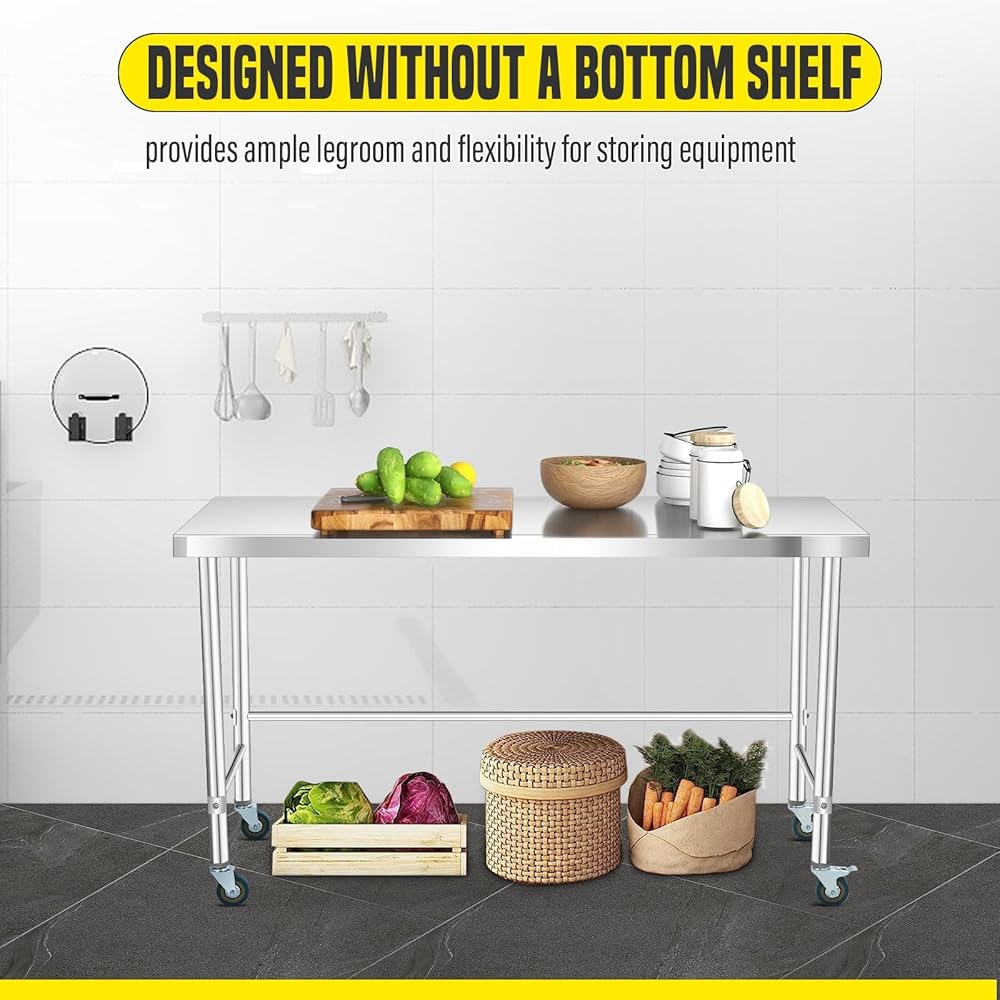Upgrade your kitchen workspace with our Stainless Steel Table 60x24 Inches featuring Wheels Casters and an Open Base Design. This commercial-grade table is expertly crafted from premium stainless steel, ensuring exceptional durability and a long-lasting, rust-resistant surface ideal for both professional and home kitchens. The open base design eliminates the undershelf, providing maximum flexibility and easy access for cleaning or storing larger items underneath. Reinforced with a robust frame and anti-wobble structure, this table delivers outstanding stability, giving you a reliable and secure work surface for food prep, baking, or any kitchen task.