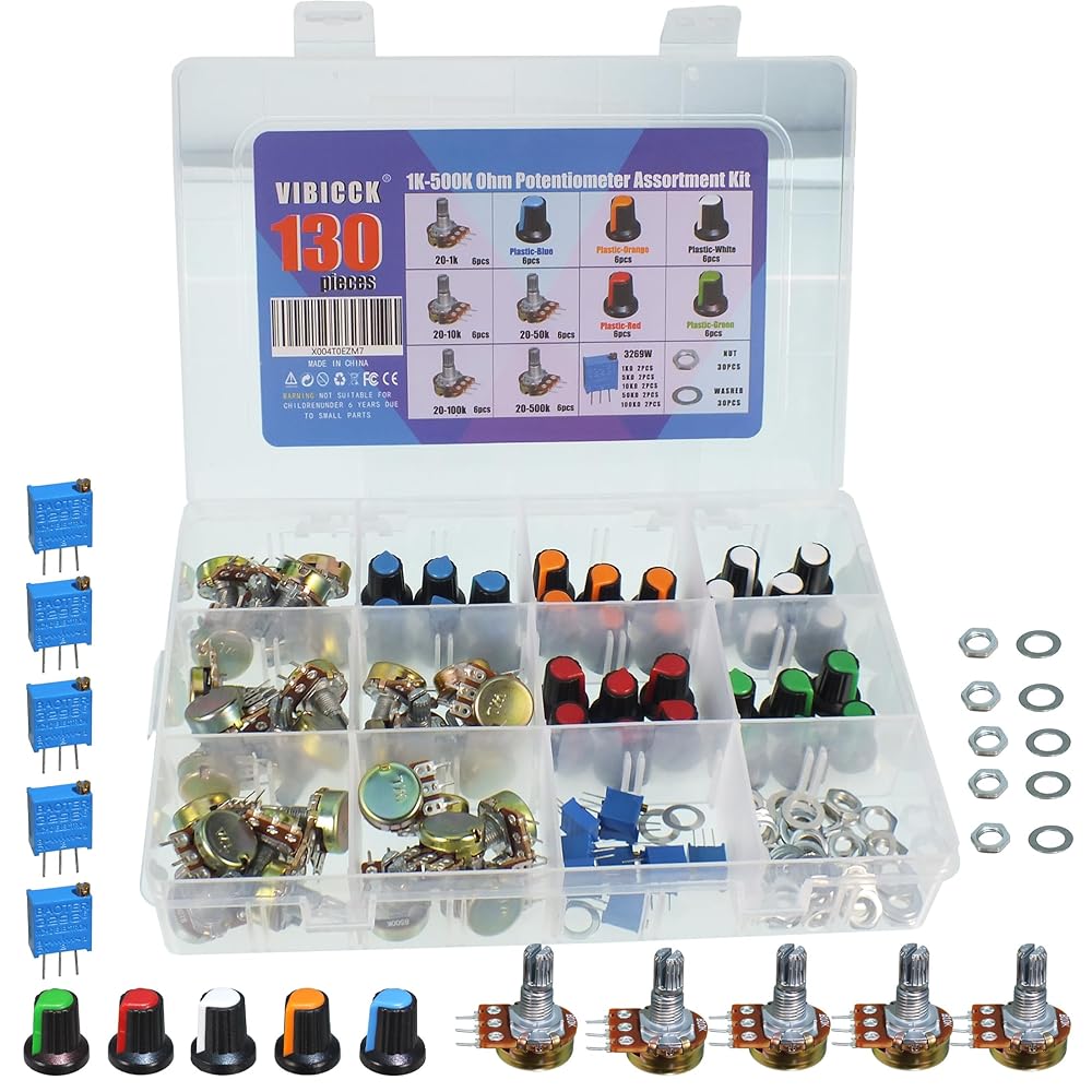 في هذه المجموعة، سوف تحصل على مقاومات B5K - B100K أوم (تحتوي المجموعة على 5 قيم مقاومة مختلفة، كل منها 6 قطع)، ومقياس الجهد المخروطي الدوار، و30 مكونًا مع صواميل، و30 حلقة، و30 حاوية Arduino. إجمالي 12 منتجًا يمكنه تلبية جميع احتياجاتك اليومية.